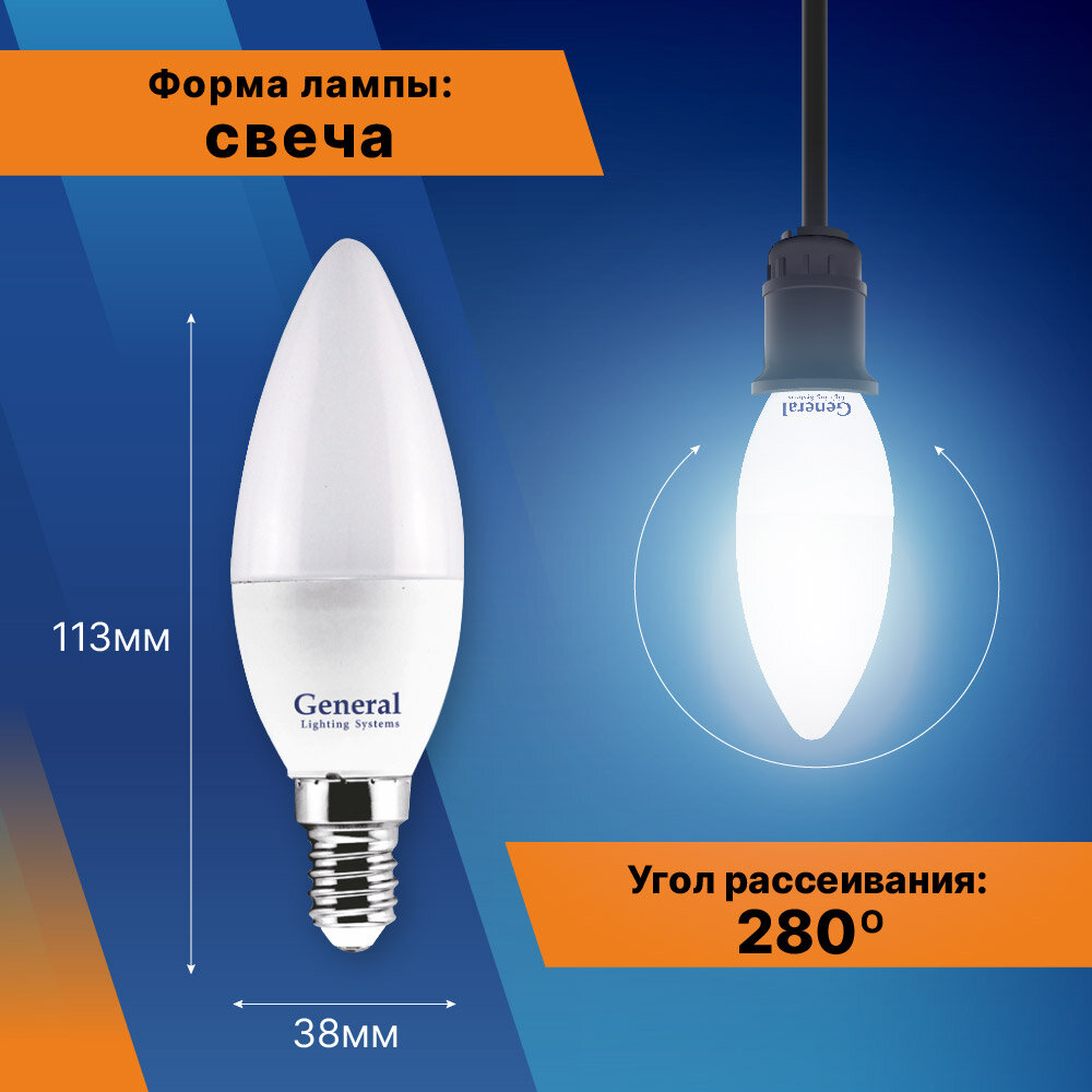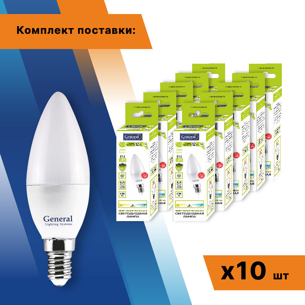 (10шт)Лампочка светодиодная 12Вт свеча 4500К General 649928 GLDEN-CF-12-230-E14-4500 интересное: