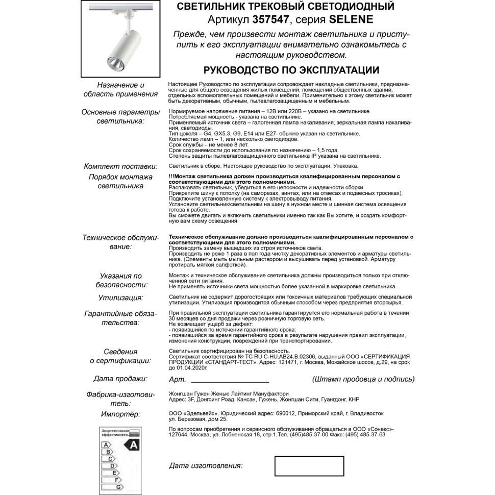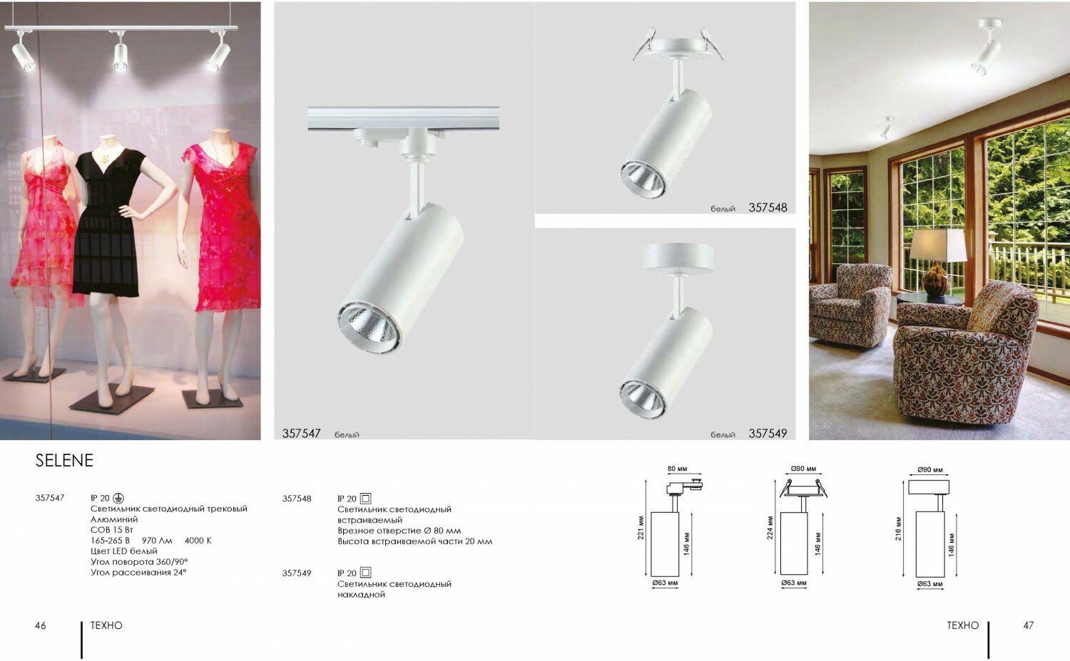 Светильник белый 357547 трековый однофазный трехжильный IP20 LED 4000K 15W 160-265V SELENE
