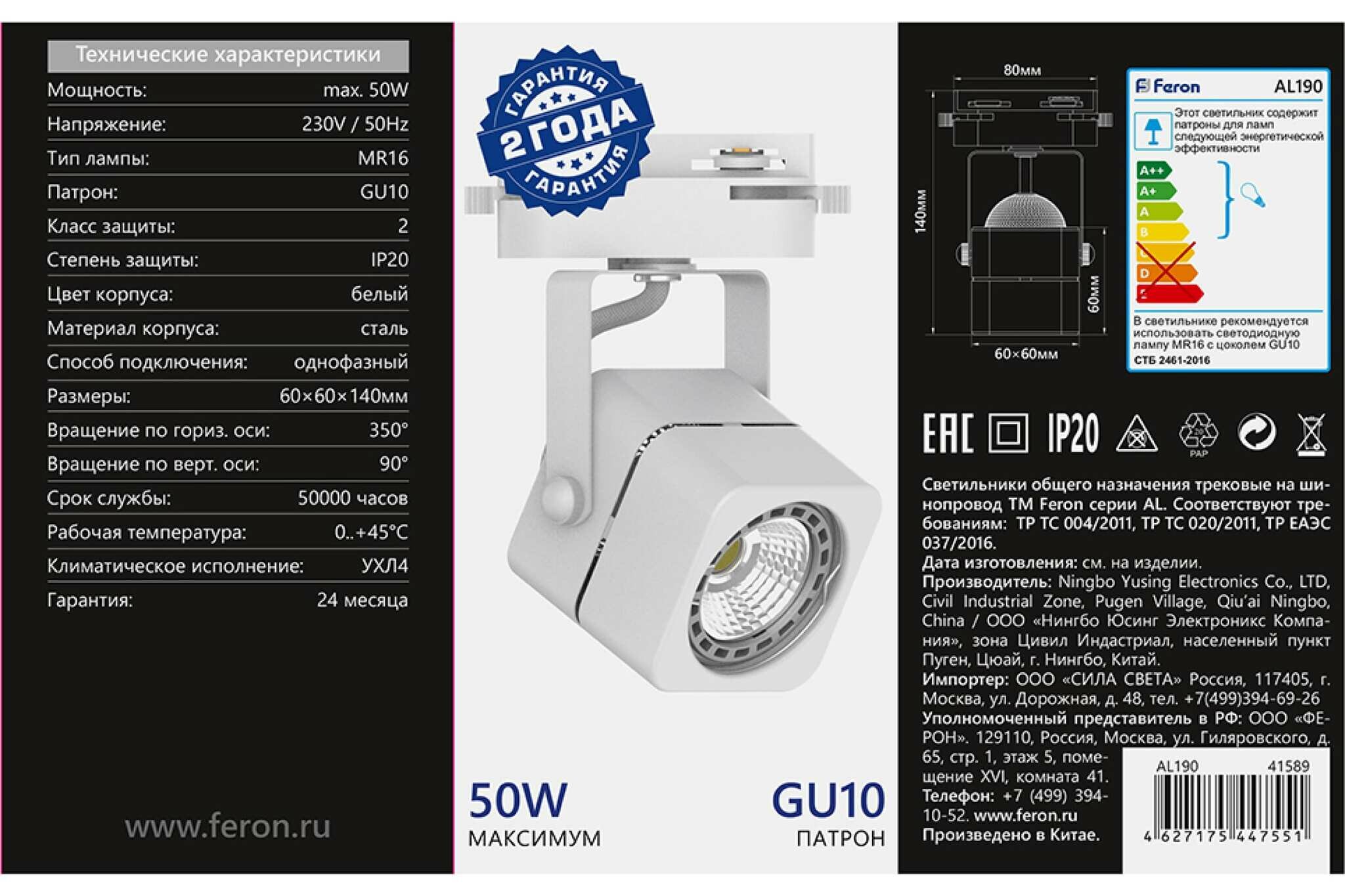 | Дополнительная информация | тип лампы MR16; вращение по горизонтальной оси 350 град.; вращение по вертикальной оси 90 град. |