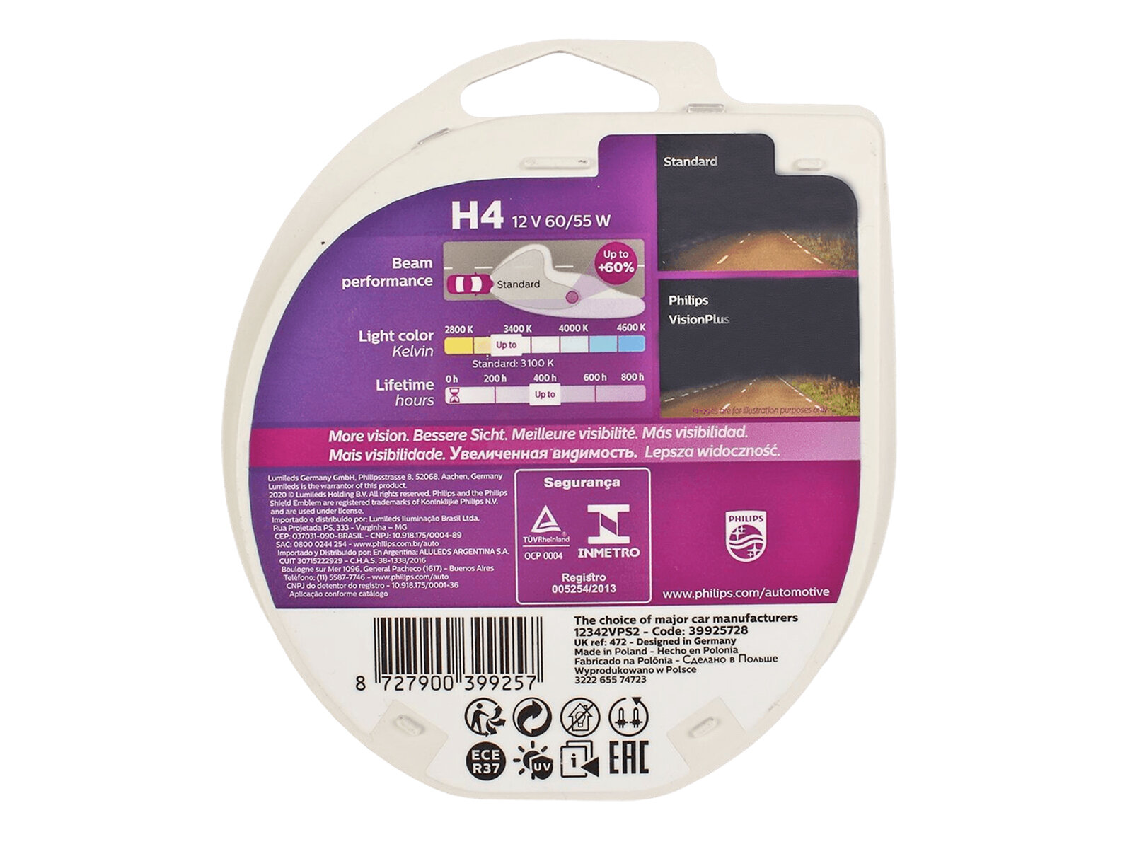 Лампа 12V H4 60/55W P43t +60% бокс (2шт.) Visionplus, 12342VPS2, PHILIPS