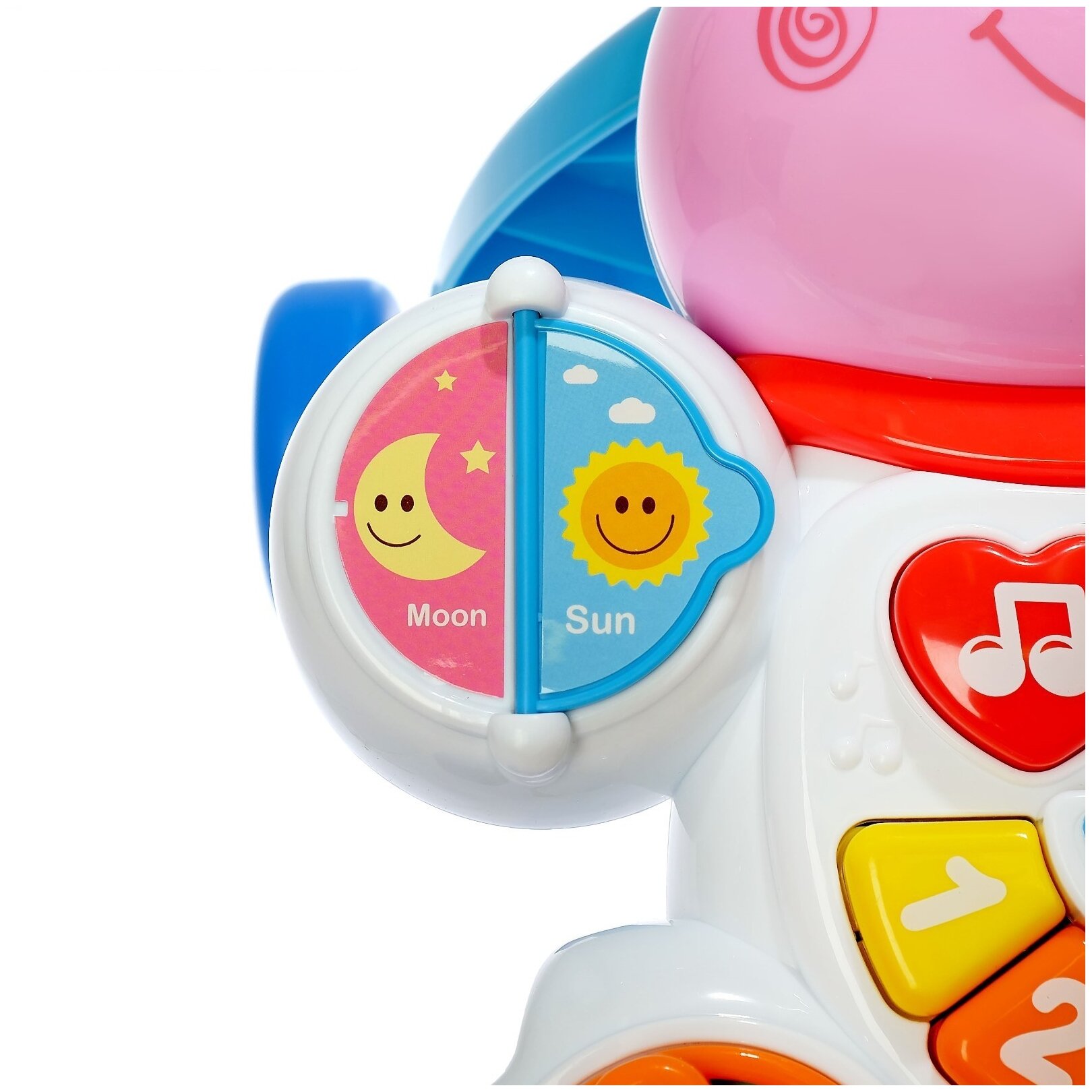 | Дополнительная информация | Каталка имеет световые и звуковые эффекты. На игровой панели можно играть на пианино, крутить шестерёнки и нажимать на кнопочки. Работает от 3 батареек типа AA, в комплект не входят. |