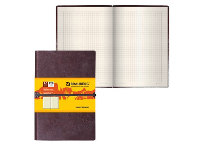 Бизнес-блокнот Brauberg А6, 100*150 мм, "Western", гладкий кожзам, резинка, клетка, 128 листов, коричневый (125241)