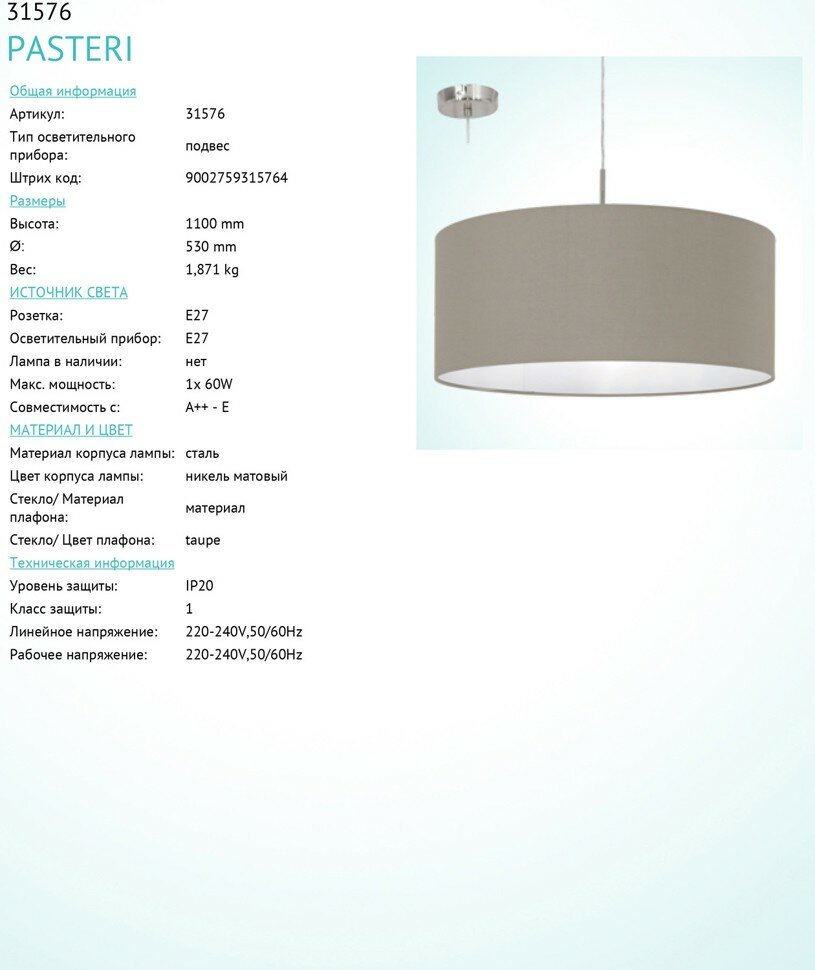 Ниже Вы можете прочитать отзывы на Текстильный подвесной светильник Eglo 31576 PASTERI, ознакомится с подробными характеристиками, посмотреть интересные обзоры и фотографии на Текстильный подвесной светильник Eglo 31576 PASTERI.