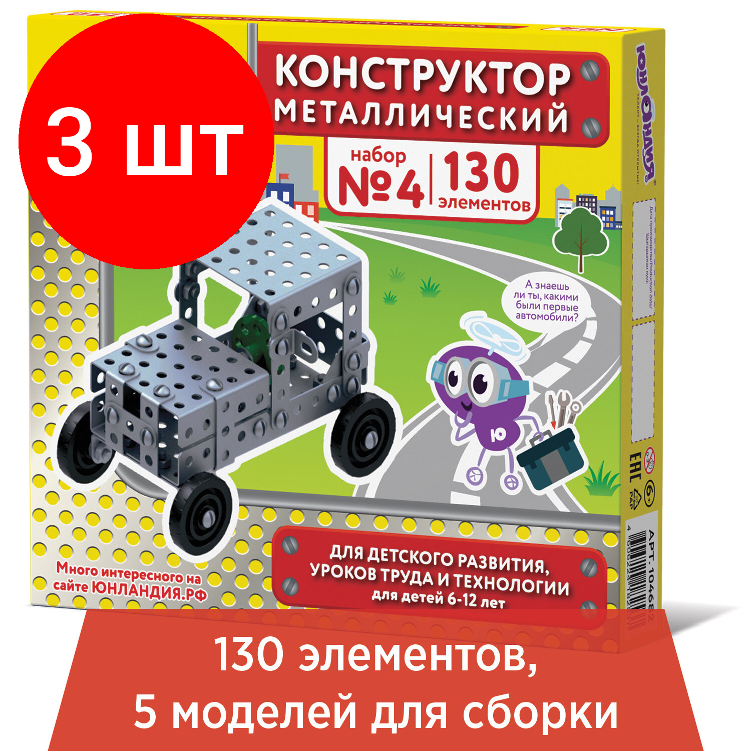 Купить Комплект 3 шт, Конструктор металлический юнландия "Для уроков труда №4", развивающий, 130 элементов, 104682