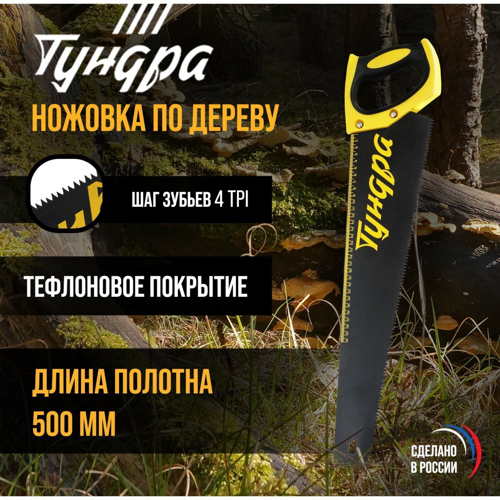 Ножовка по дереву тундра, 500 мм, шаг 6 мм, 4 TPI, тефлоновое покрытие, зуб прямой крупный