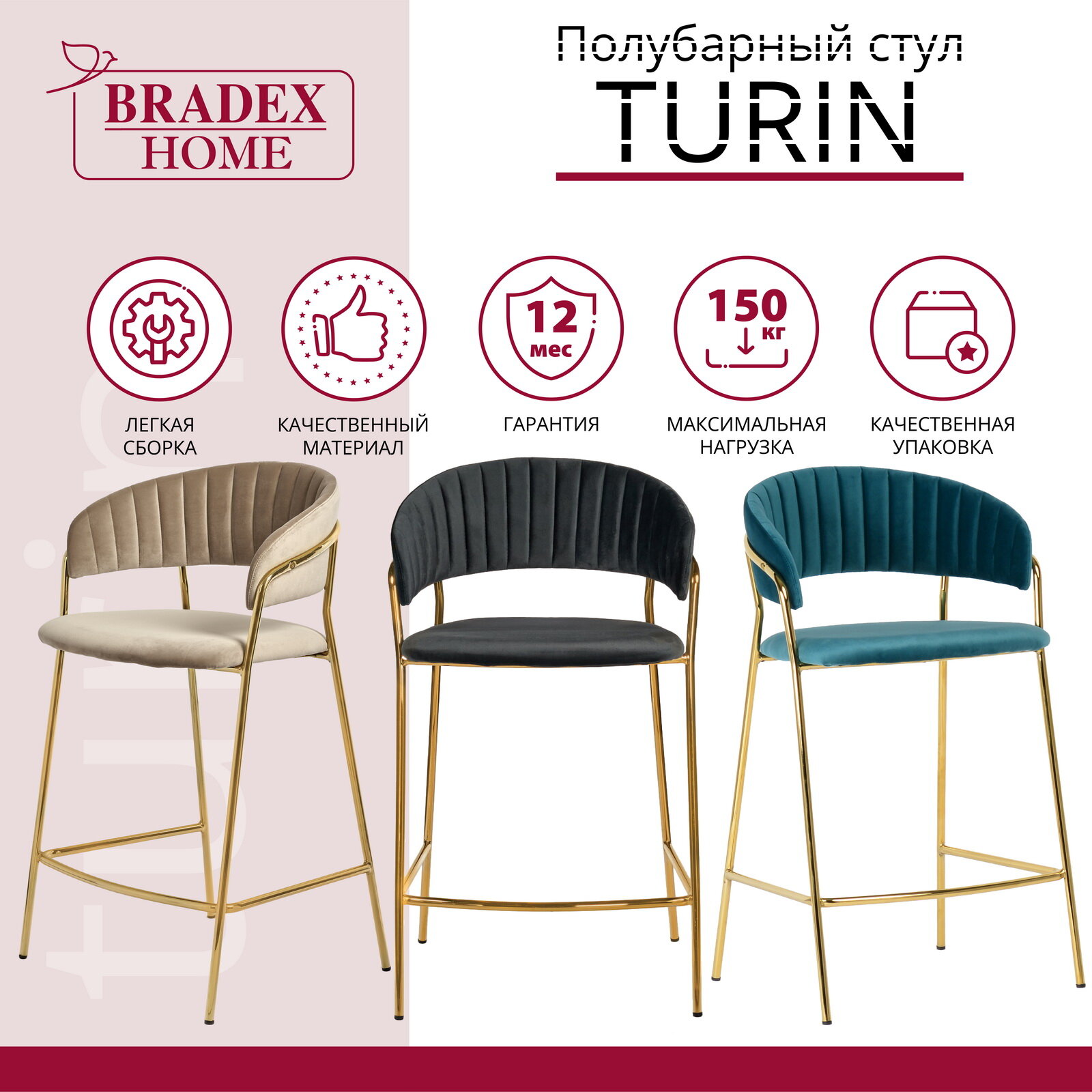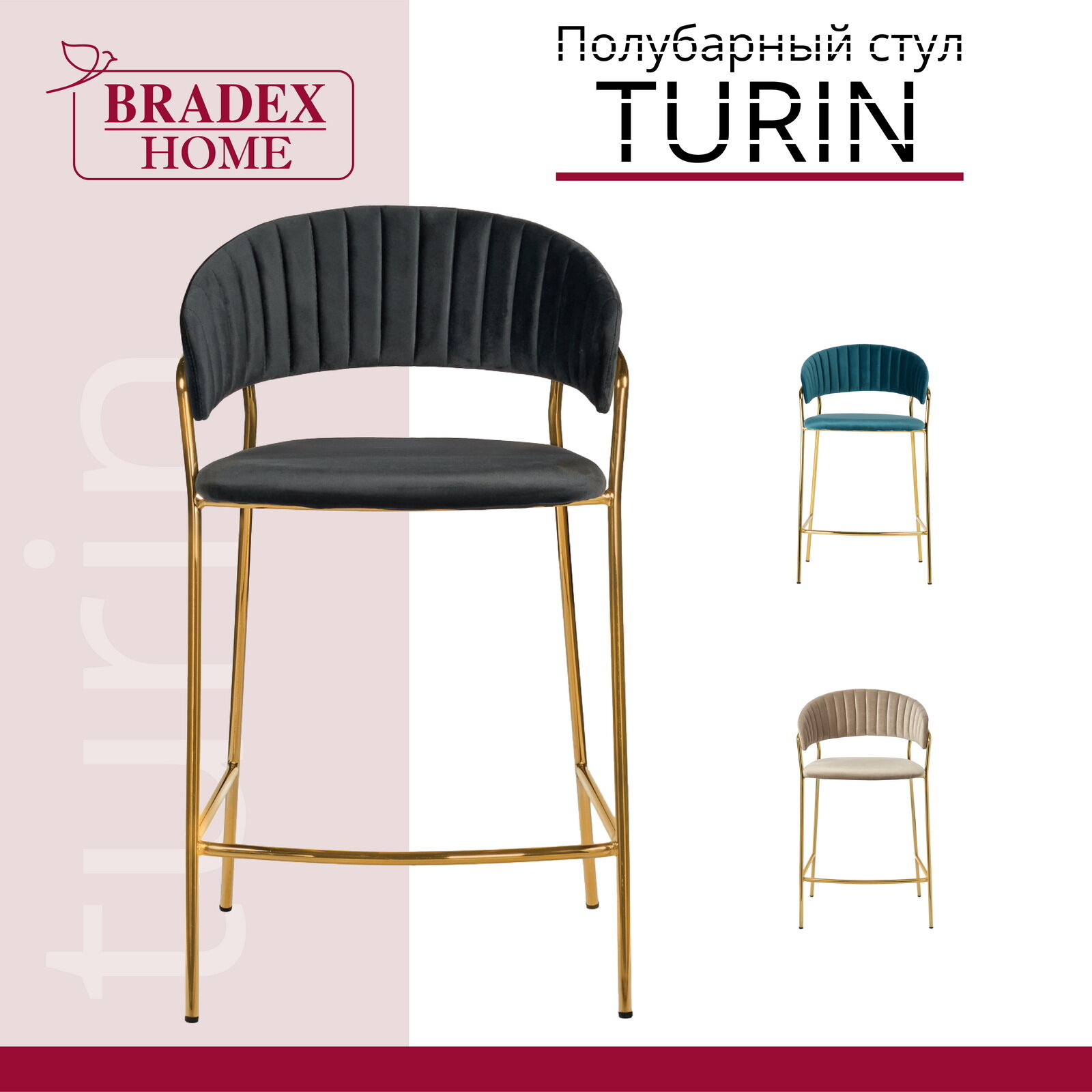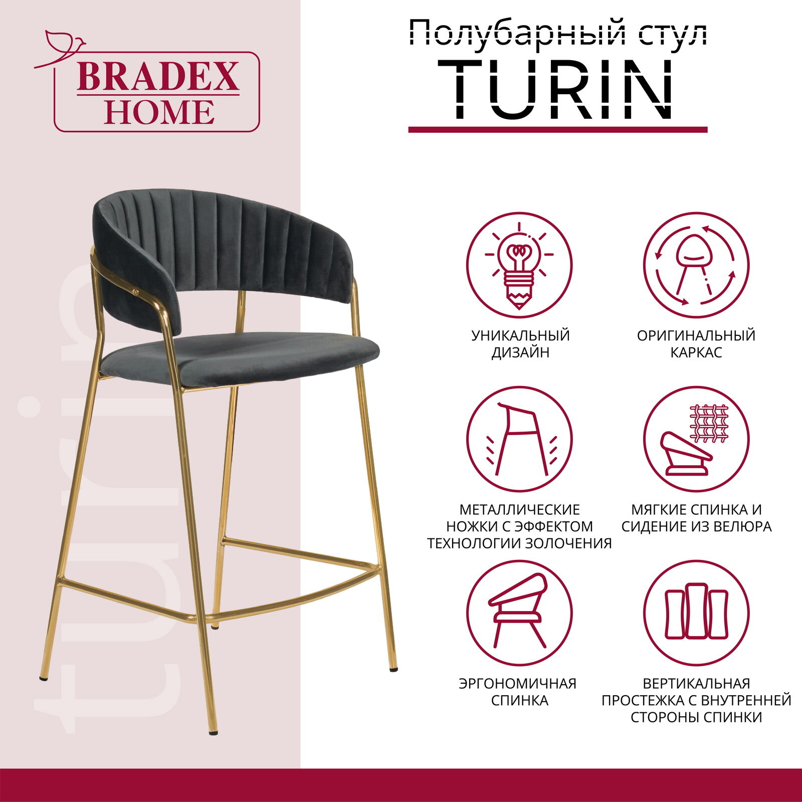 Стул полубарный Bradex Home Turin винный с золотыми ножками (fr0716) .