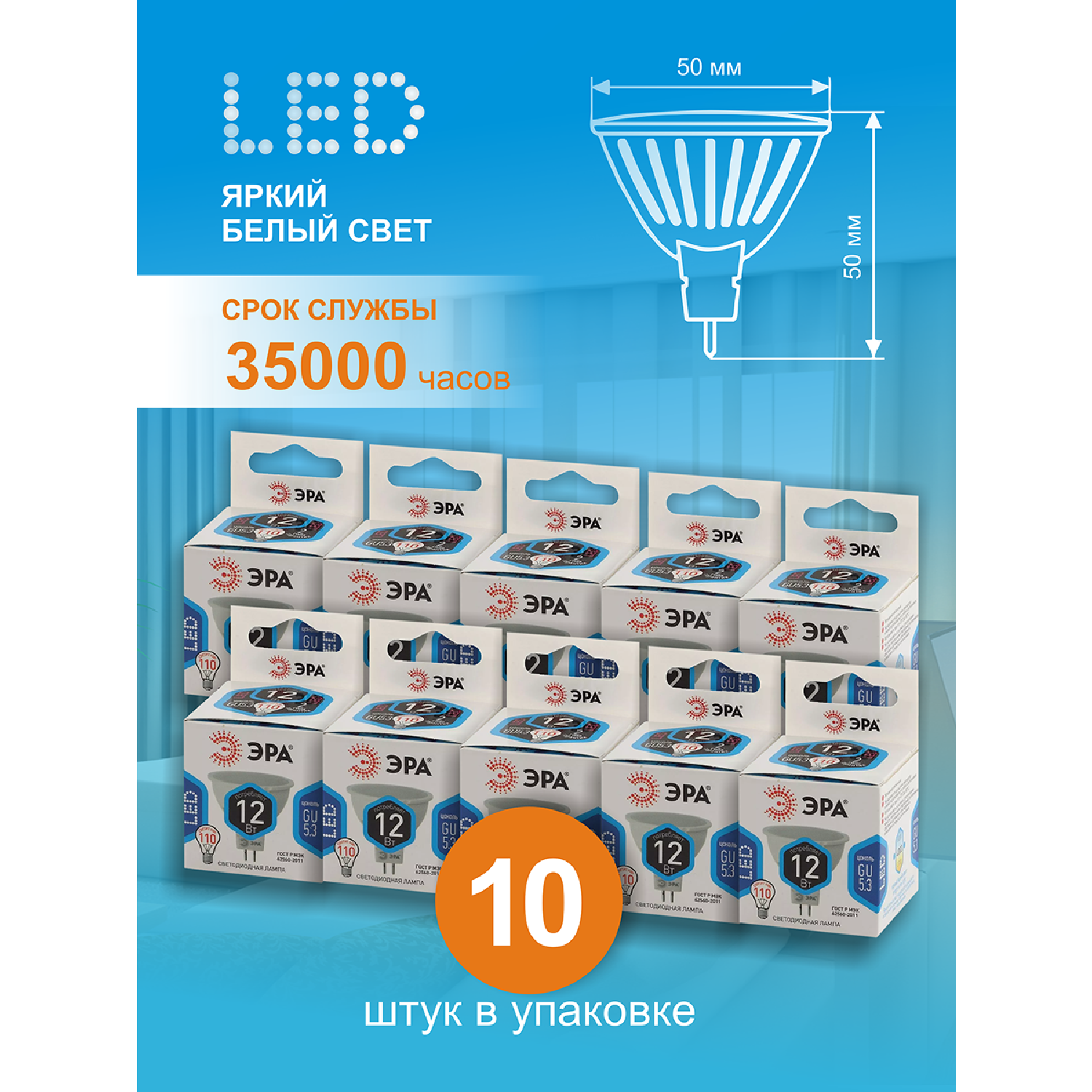 Купить Лампочка светодиодная ЭРА (набор 10 штук) STD LED MR16-12W-840-GU5.3 GU 5.3 12 ВТ софит нейтральный белый свет