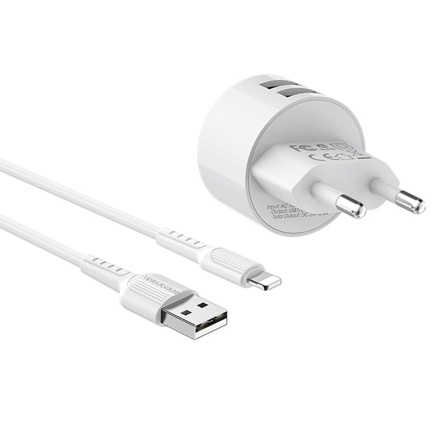 Сетевое зарядное устройство Borofone BA23A, 2xUSB, 2.4 А, кабель Lightning, белое