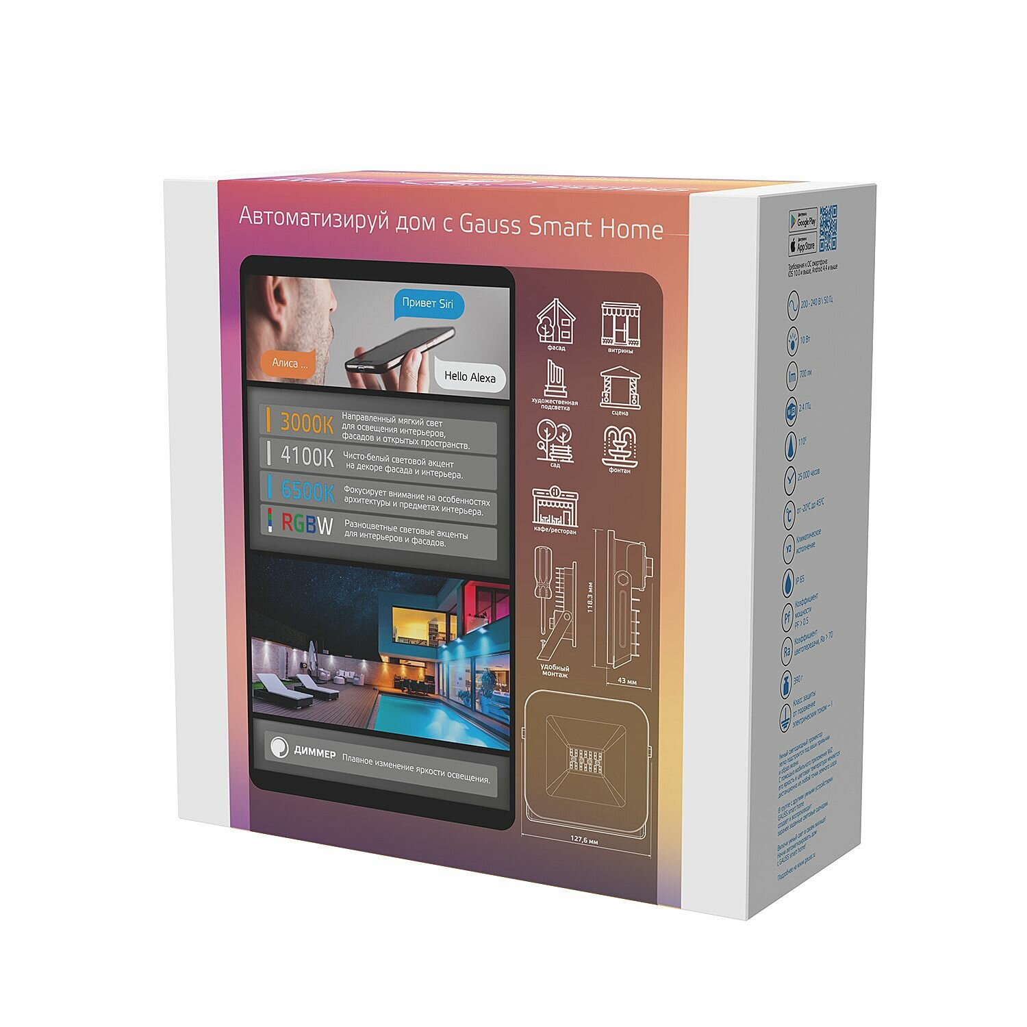 Умный прожектор SmartHome 10W 700lm 3000-6500K 220V IP65 RGBW+изм.цв.темп.+диммирование Gauss