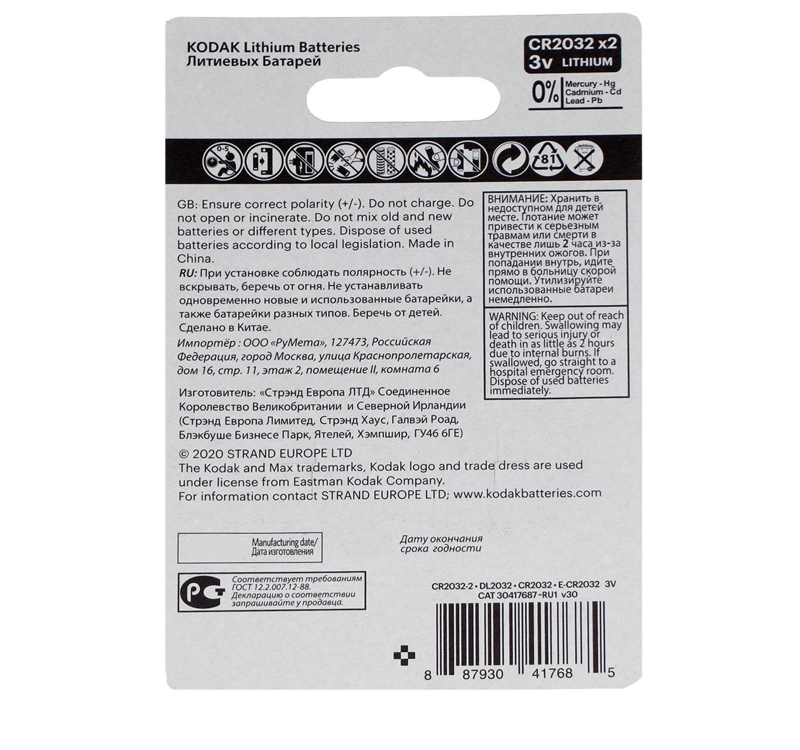 Кодак / Kodak - Батарейки Max Lithium CR2032 3V 2 шт