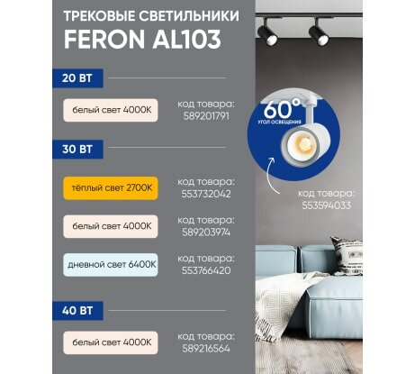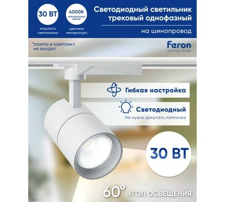 СохранитьFERON Трековый светодиодный светильник на шинопровод FERON 30W, 2400 Lm, 4000К, 60 гр, белый, AL103 32521 интересное: