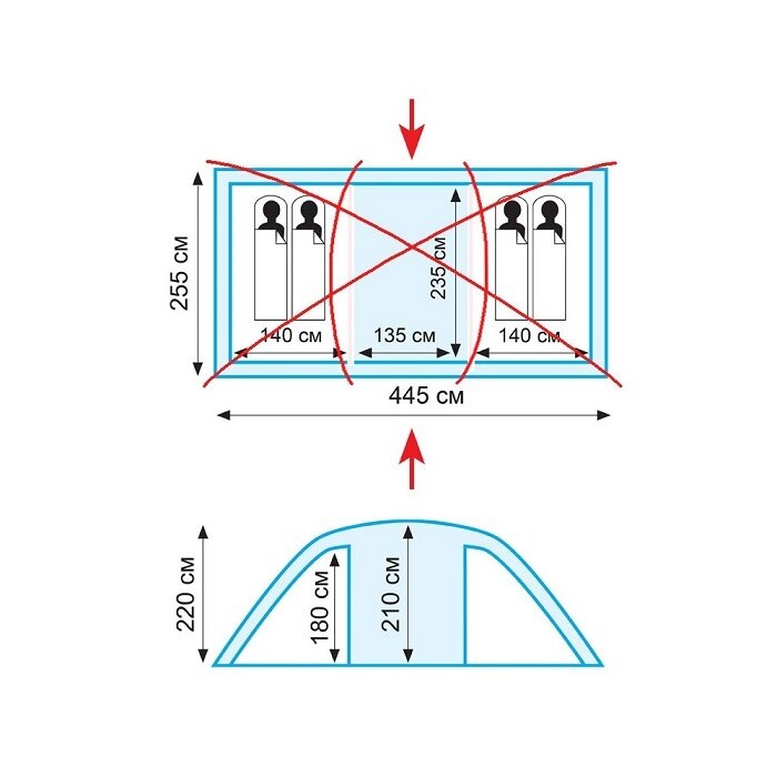 | Габариты внешней палатки(ДxШxВ) | 445x255x220 cм |