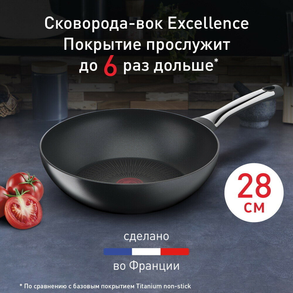 Сковорода вок Tefal Excellence G2691972, диаметр 28 см, с индикатором температуры, глубокая с антипригарным покрытием, для газовых, электрических и индукционных плит, сделано во Франции
