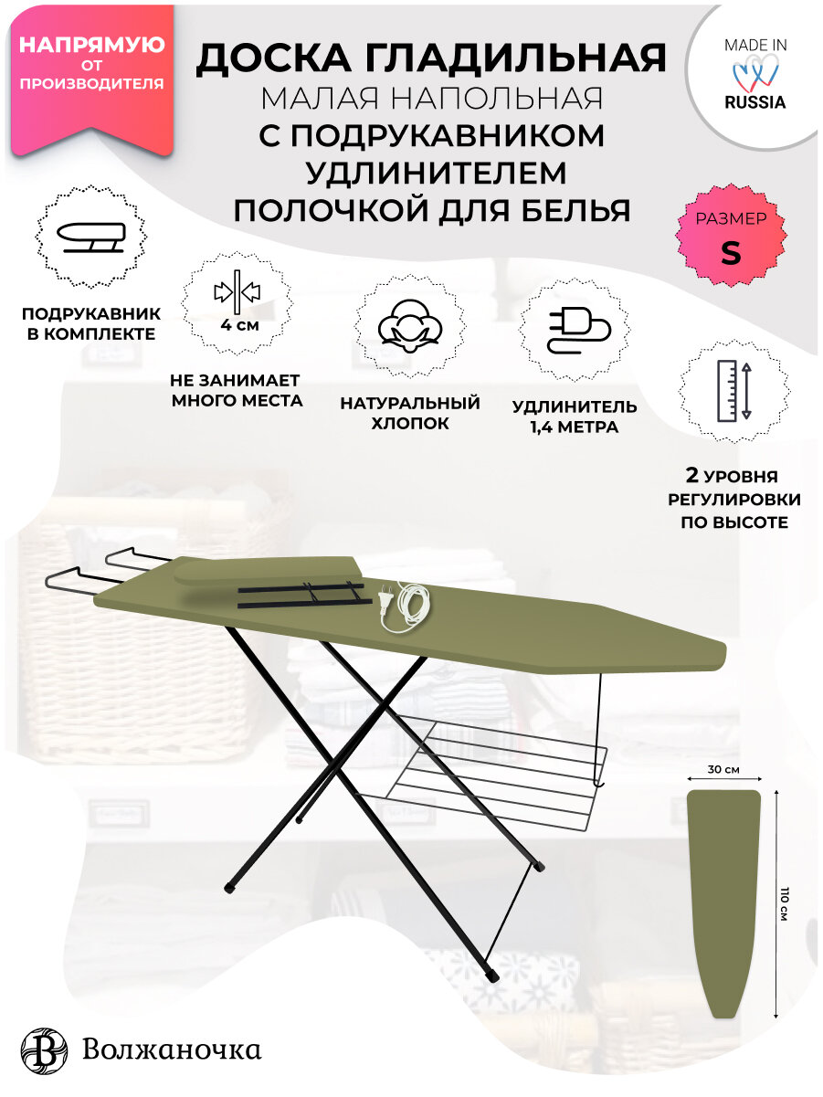 СохранитьВолжаночка Доска гладильная напольная складная с подрукавником, подставкой для утюга, полочкой для белья, розеткой и удлинителем, размер 110х30 см., цвет оливковый интересное: