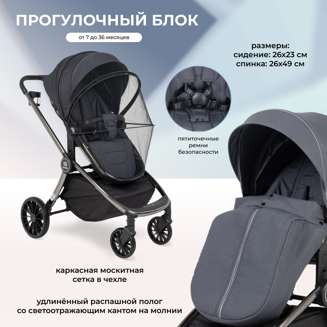 Коляска модульная 3 в 1 Farfello Baby Shell / BBS / с рождения до 3 лет / цвет темно-серый / черная рама / BBS-004