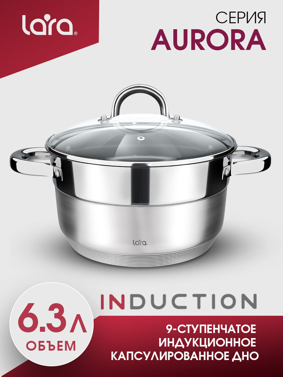Кастрюля из нержавеющей стали LARA LR02-404 AURORA/ 6.3 л/ стальные ручки/ капсулированное/ индукционное дно/ крышка с паровыпуском