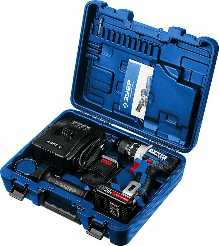 ЗУБР 20В бесщеточная дрель-шуруповерт, 2 АКБ (2Ач), в кейсе, Профессионал. DB-201-22