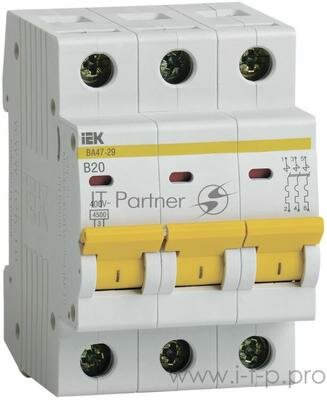 Выключатель автоматический модульный 3п B 20А 4.5кА ВА47-29, IEK MVA20-3-020-B (1 шт.)