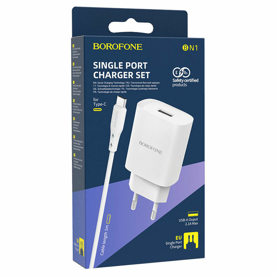 Купить Сетевое зарядное устройство BOROFONE BN1 Innovative 1xUSB с Кабелем USB - Type-C, 2.1A, белый