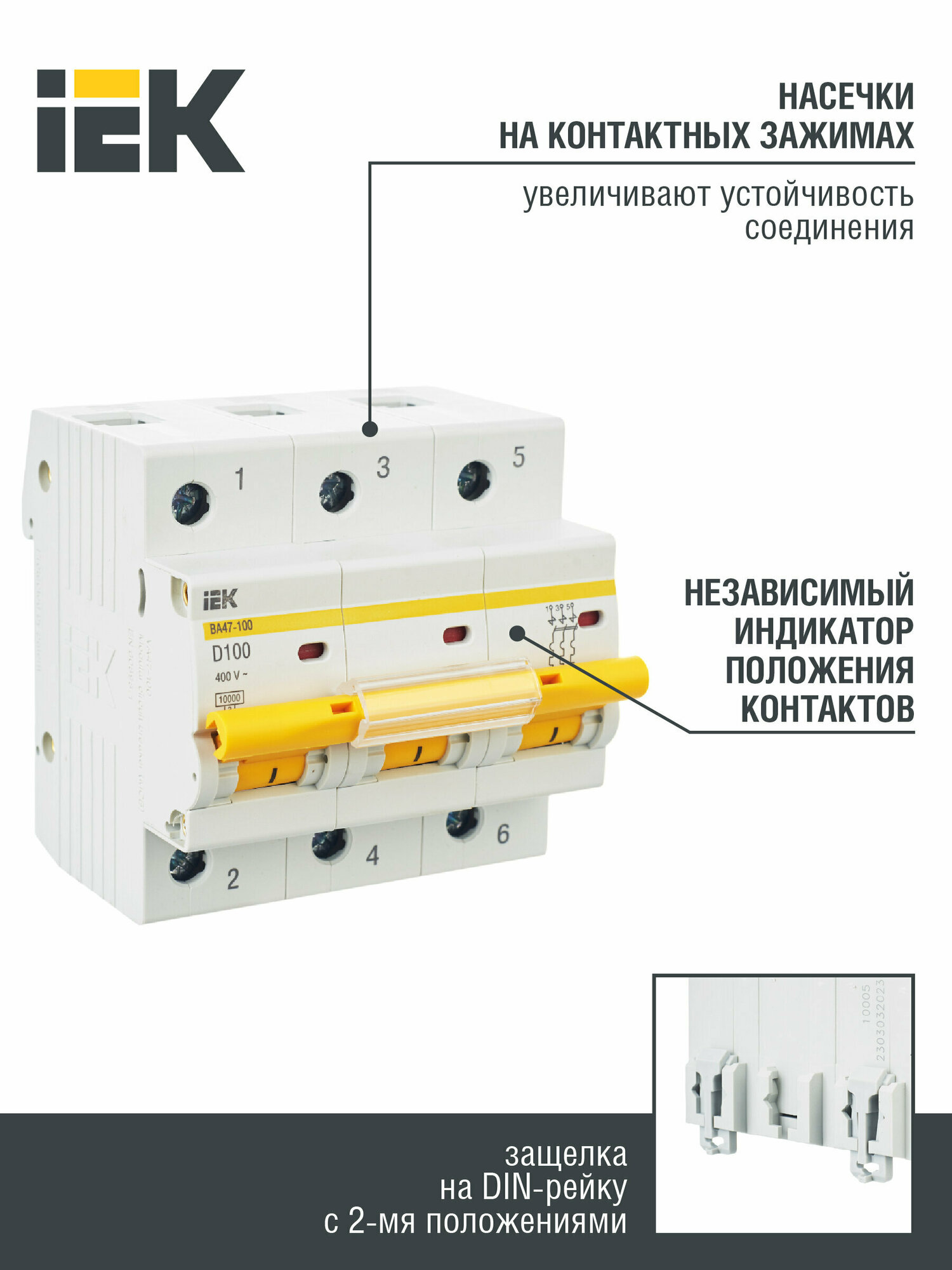 Выключатель автоматический модульный 3п D 100А 10кА ВА47-100 IEK MVA40-3-100-D (1 шт.)