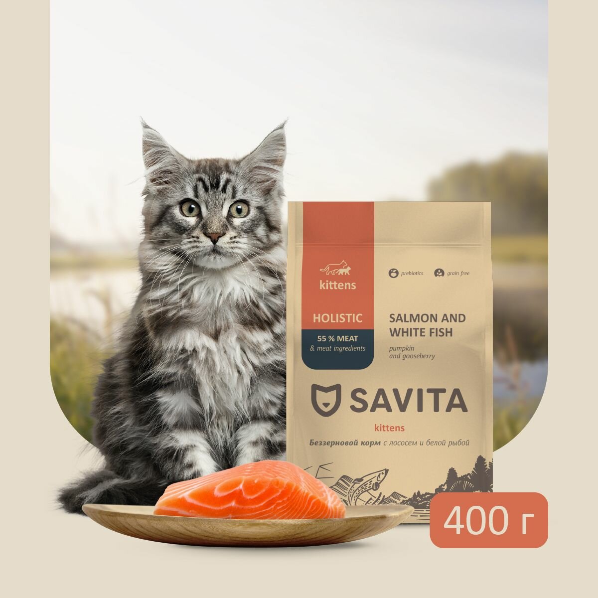 SAVITA Беззерновой корм для котят с лососем и белой рыбой 400г 0.4 кг