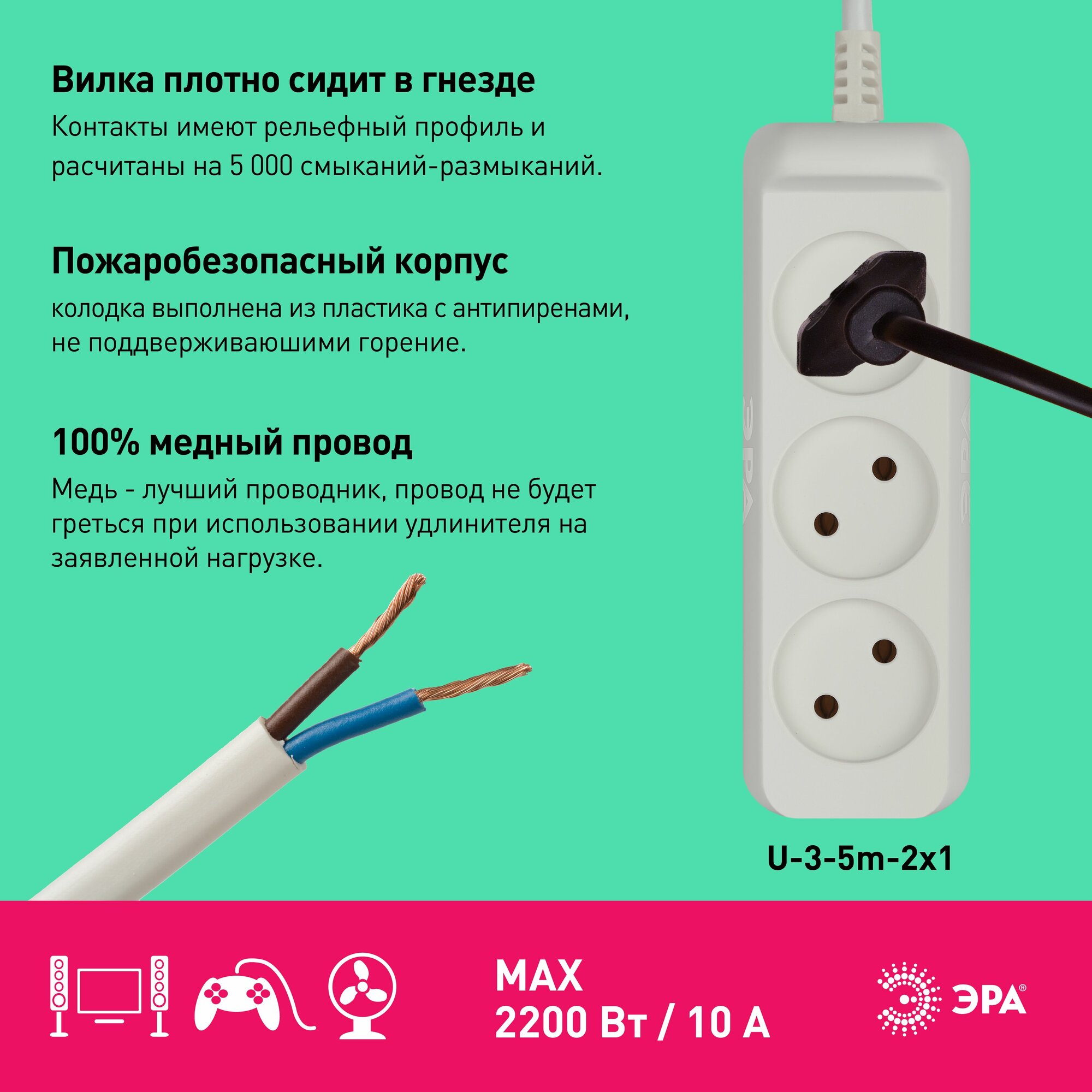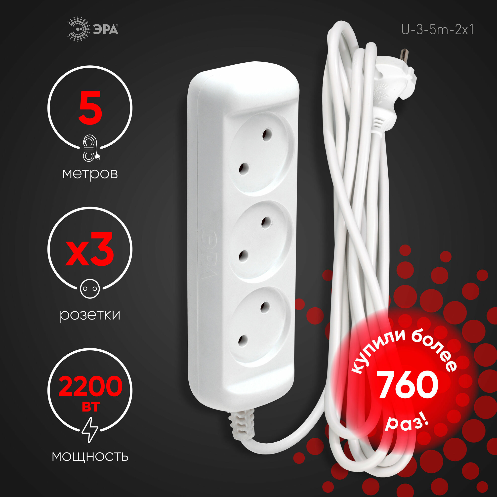 Купить Удлинитель электрический ЭРА U-3-5m-2x1 без заземления 3 розетки 5м ПВС 2x1мм² 10А арт. Б0028356 (1 шт.)