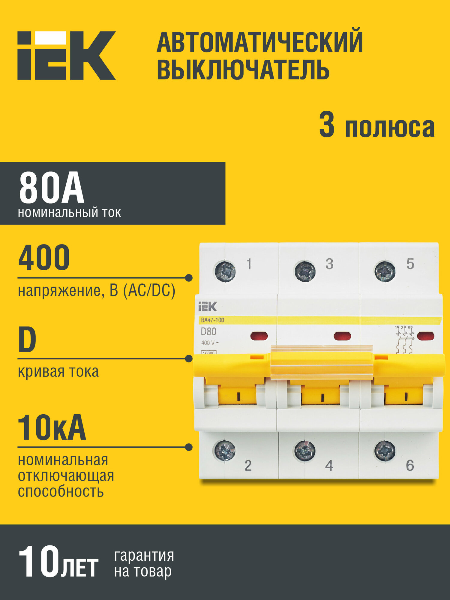 2шт. - Выключатель автоматический трехполюсный 80А D ВА47-100 10кА / IEK; арт. MVA40-3-080-D; оригинал / - комплект 2шт