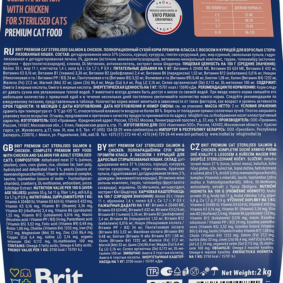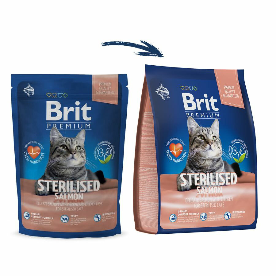 Сухой корм BRIT PREMIUM CAT STERILISED SALMON & CHICKEN для взрослых кастрированных котов и стерилизованных кошек с лососем и курицей (2 кг)