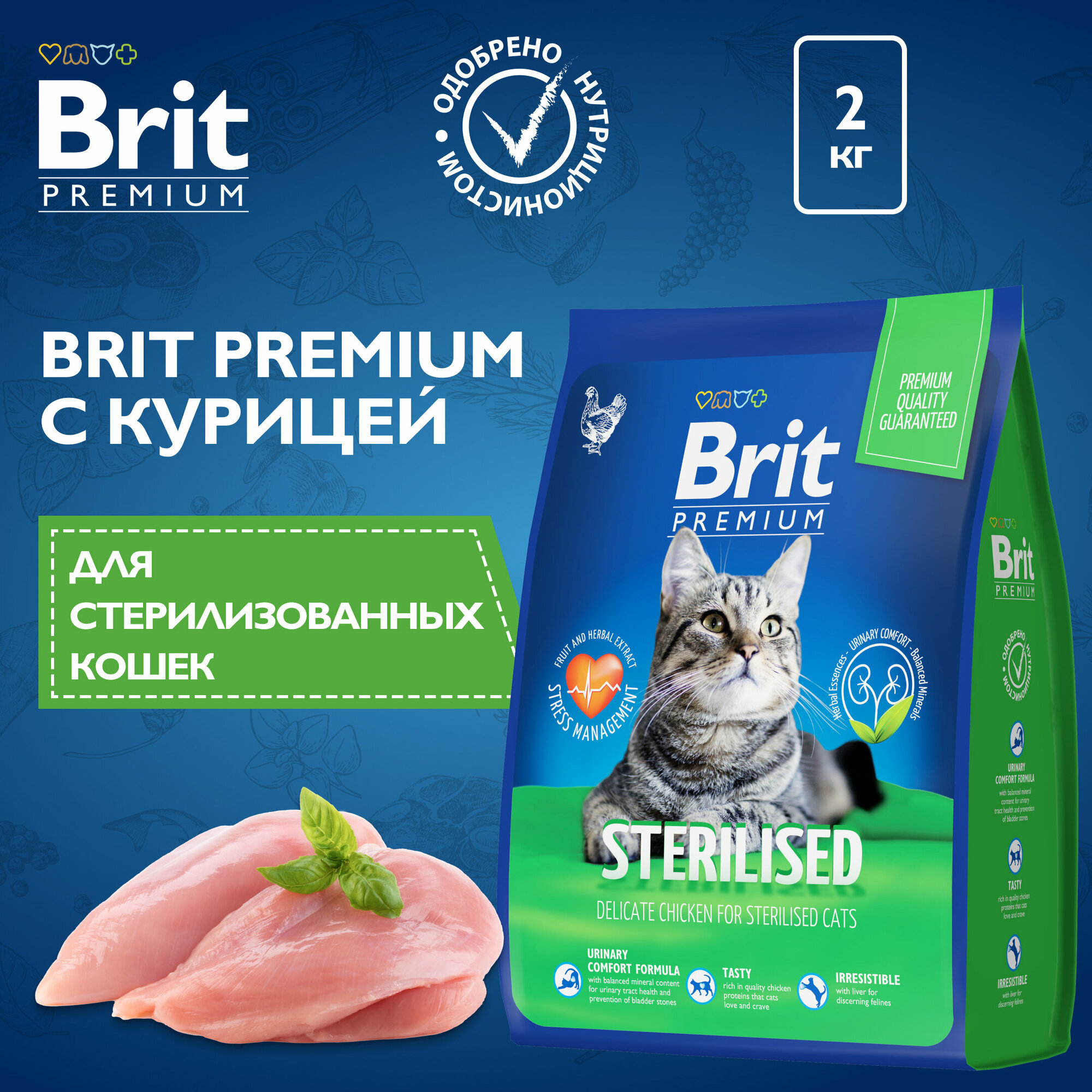Сухой корм BRIT PREMIUM CAT STERILISED CHICKEN для взрослых кастрированных котов и стерилизованных кошек с курицей (2 кг)