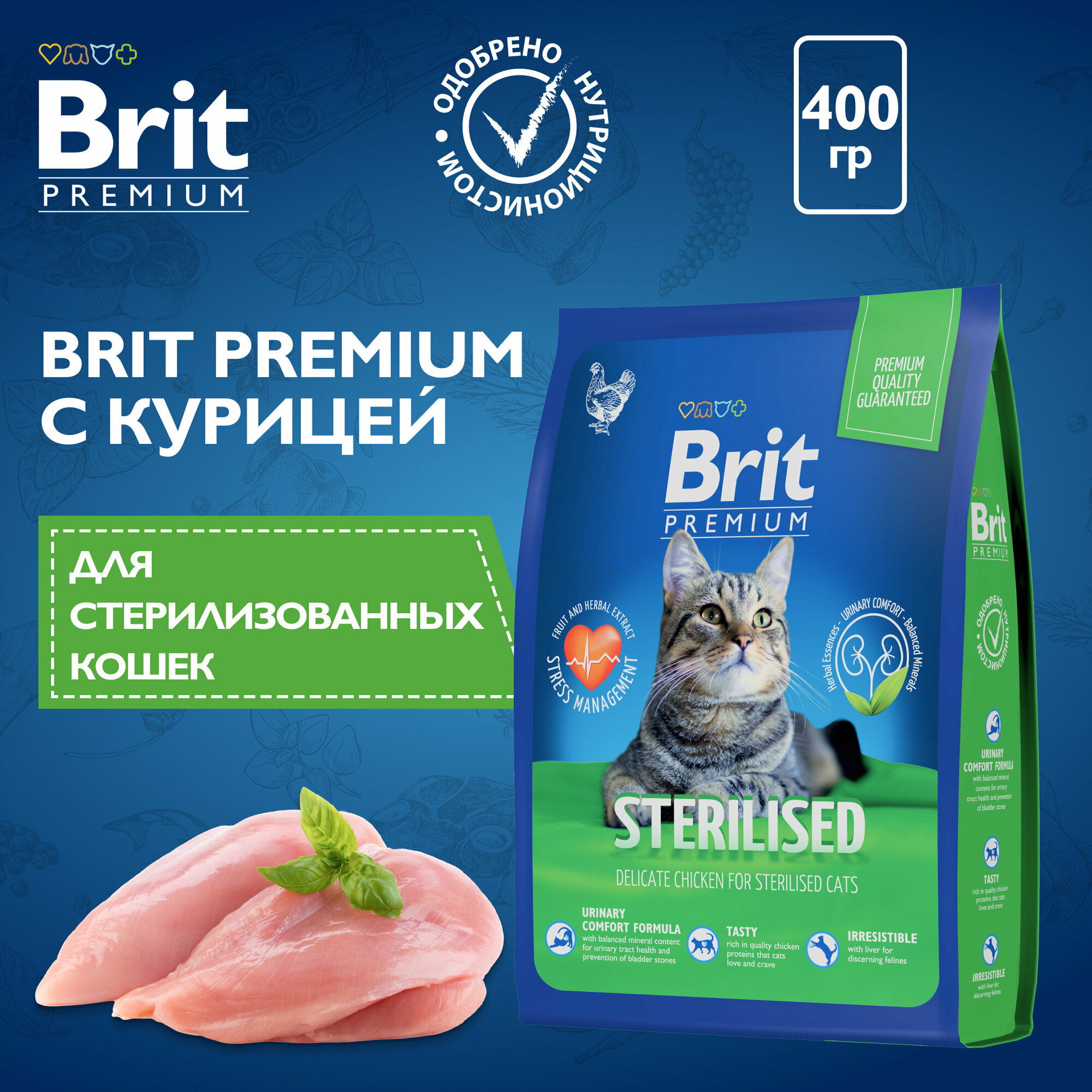 Brit Premium Cat Sterilized Chicken сухой корм премиум класса с курицей для стерилизованных кошек, 0,4кг, 1шт
