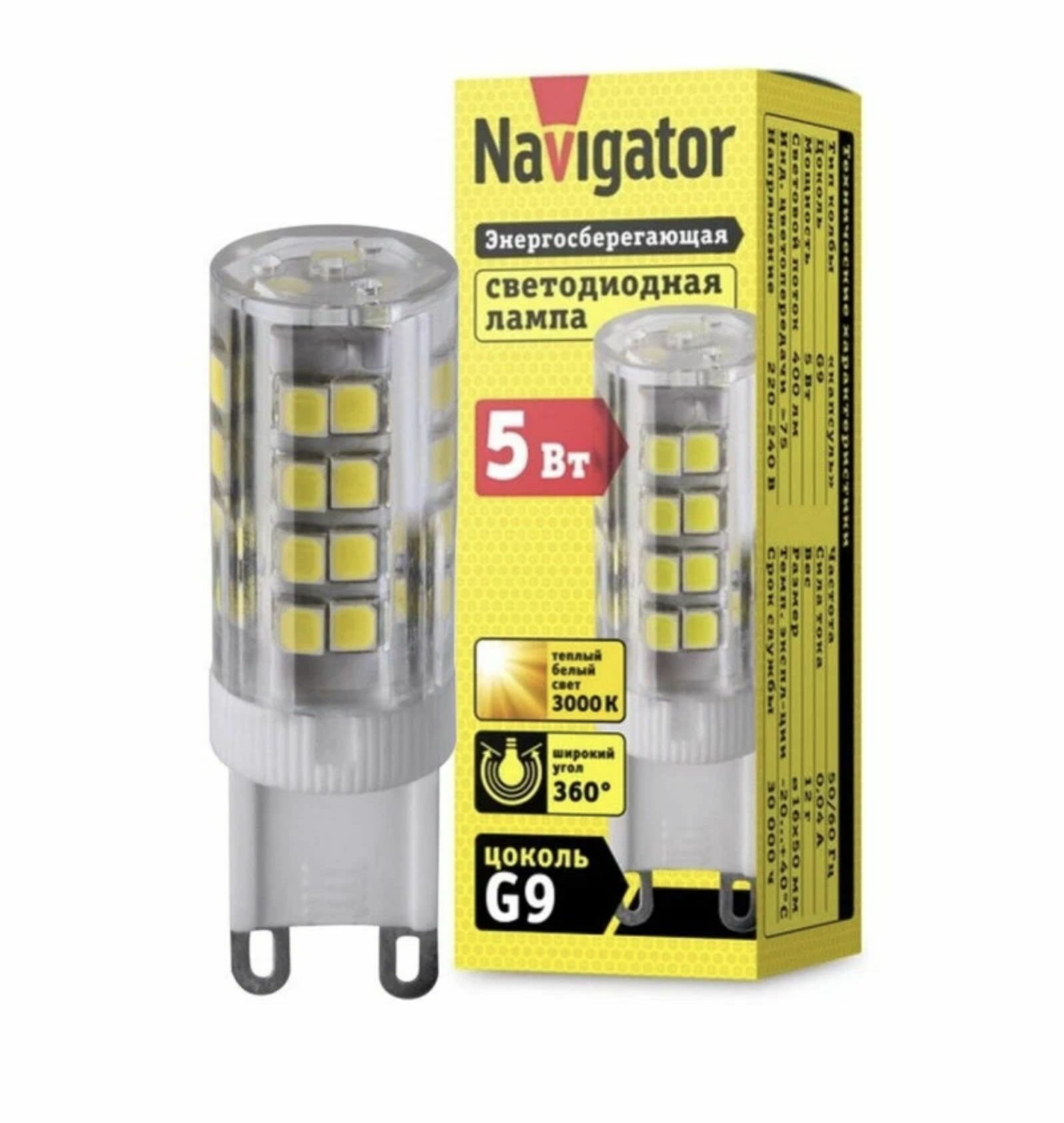 (9 шт.) Светодиодная лампочка Navigator G9, мощность 5 Вт, напряжение питания 220-240 В, цветовая температура 3000 K, теплый белый свет, световой поток 400 Лм, цоколь G9, размер 16х50 мм, NLL-P-G9-5-230-3K