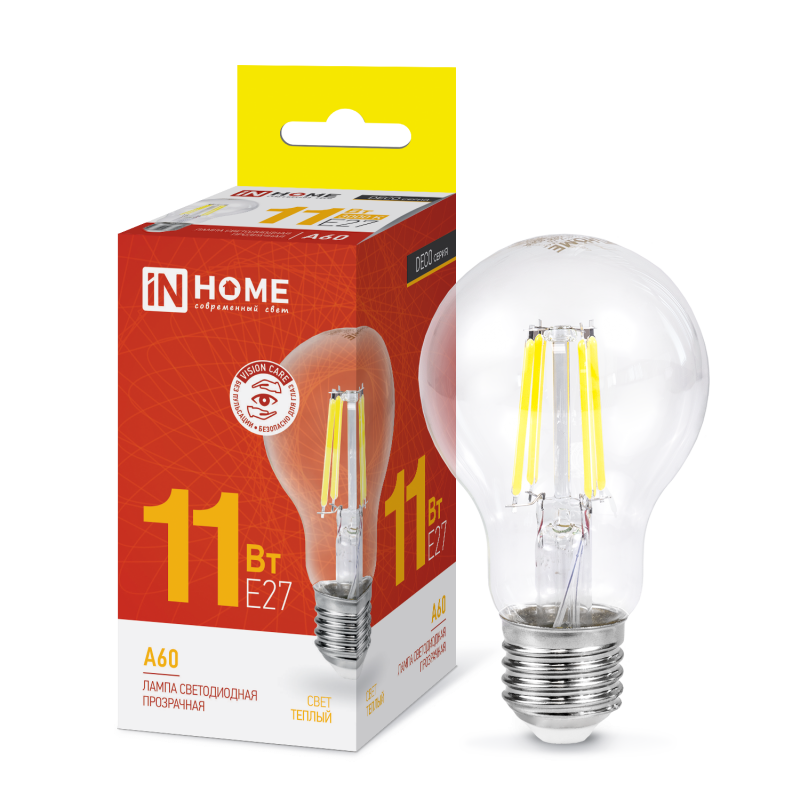 Лампочка светодиодная LED A60 deco 11Вт 230В Е27 3000К 1160Лм прозрачная IN HOME (арт. 4690612026121 )
