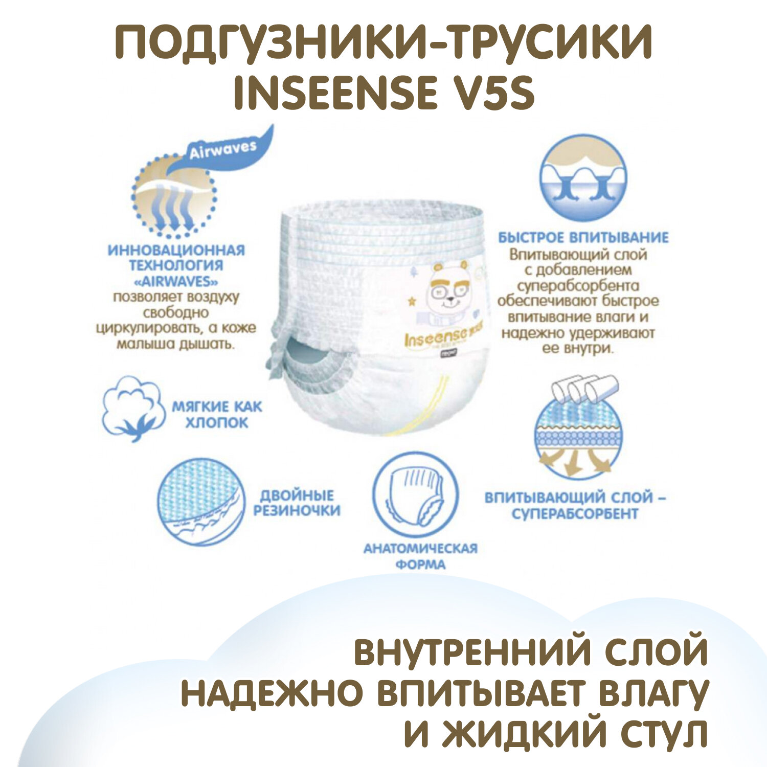 | Плюсы: | Подгузники-трусики Inseense V5S легкие, дышащие, отлично впитывают. Очень мягкие и тонкие. |