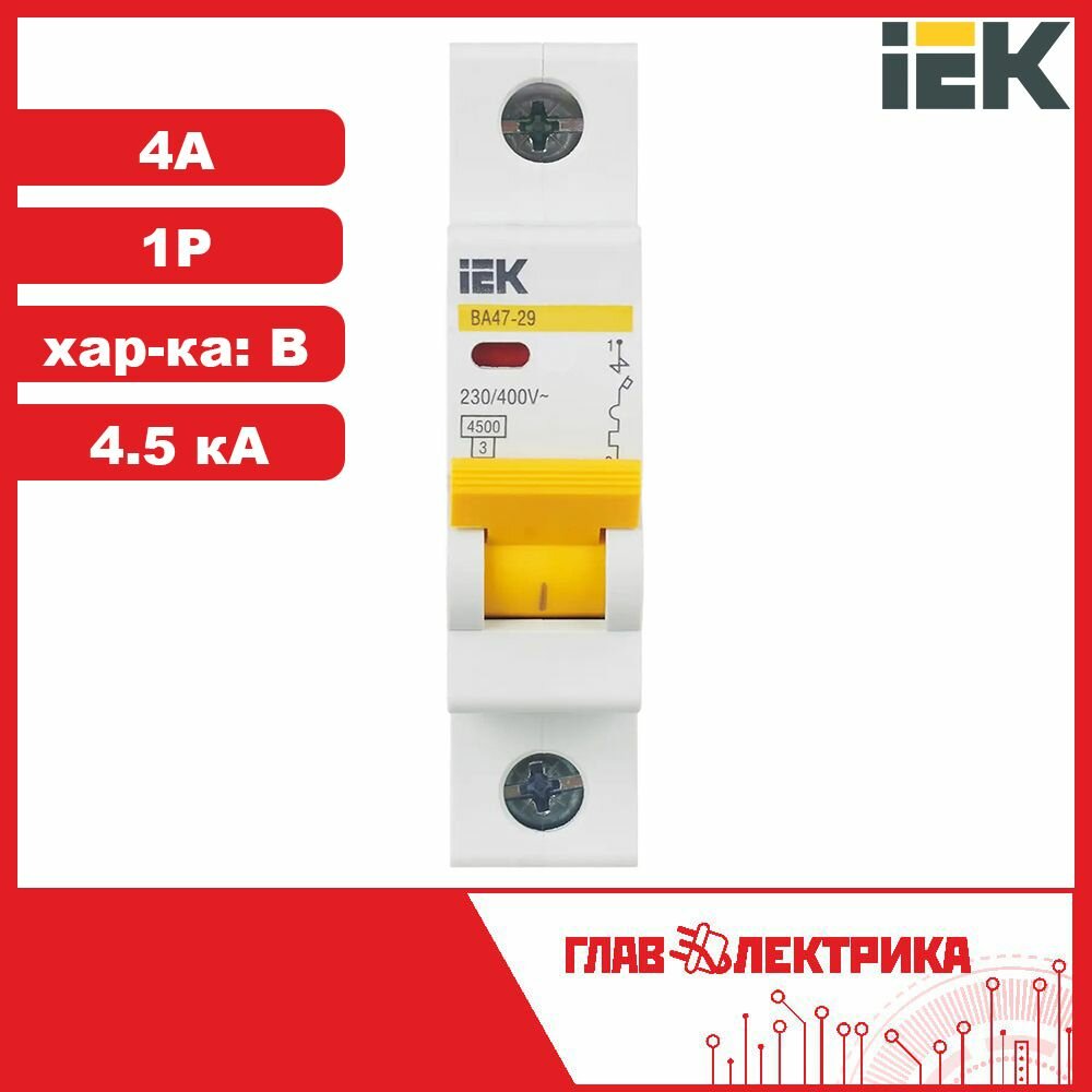 Купить Автоматический выключатель Iek 1п B 4А 4.5кА ВА47-29, MVA20-1-004-B