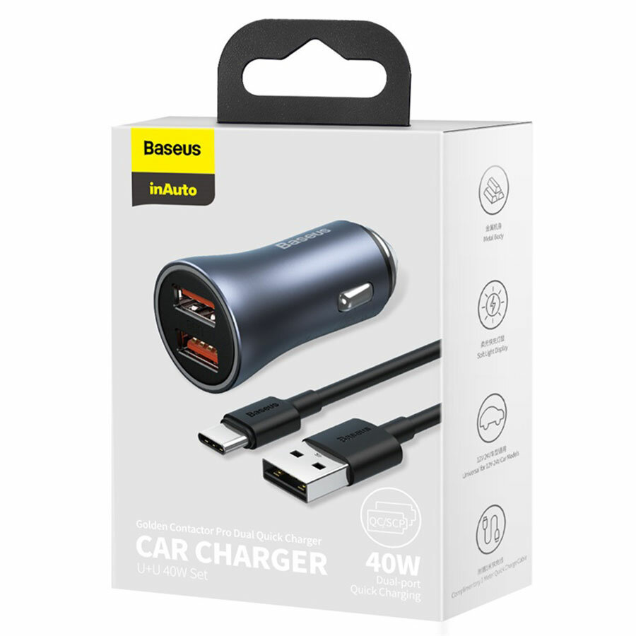 Автомобильное зарядное устройство BASEUS Golden Contactor Pro Dual, 2xUSB с Кабелем USB - Type-C, 5A, 40W, темно-серый интересное: