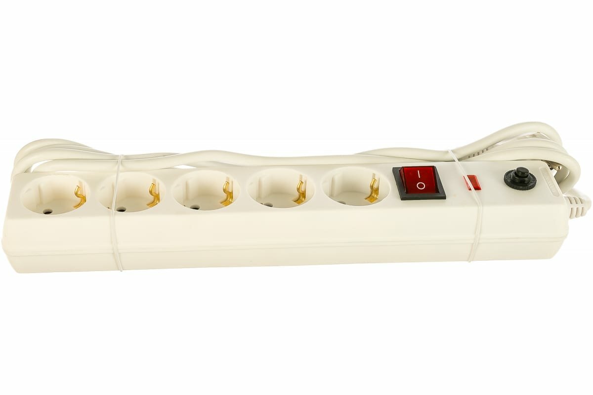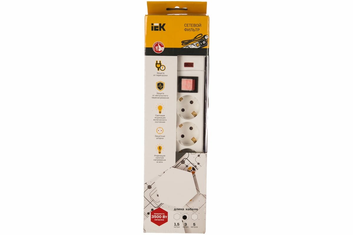 Сетевой фильтр IEK СФ-05К-выкл, 3,5 кВт, 16 А, с заземлением, с кнопкой, 5 розеток, 3 м, белый