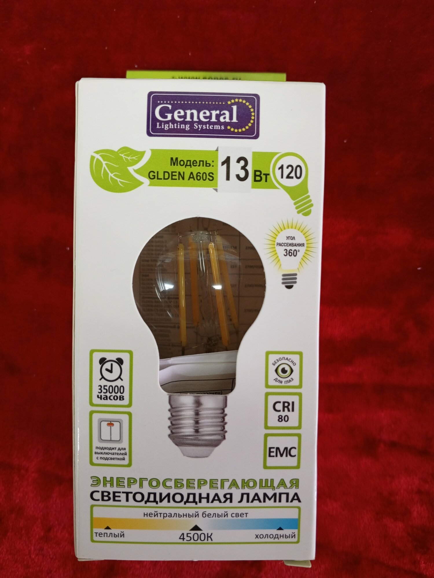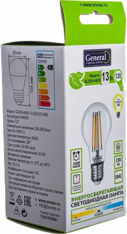 Сохранить(10шт)Лампа филамент светодиодная 13Вт груша 4500K General 646000 GLDEN-A60S-13-230-E27-4500 интересное: