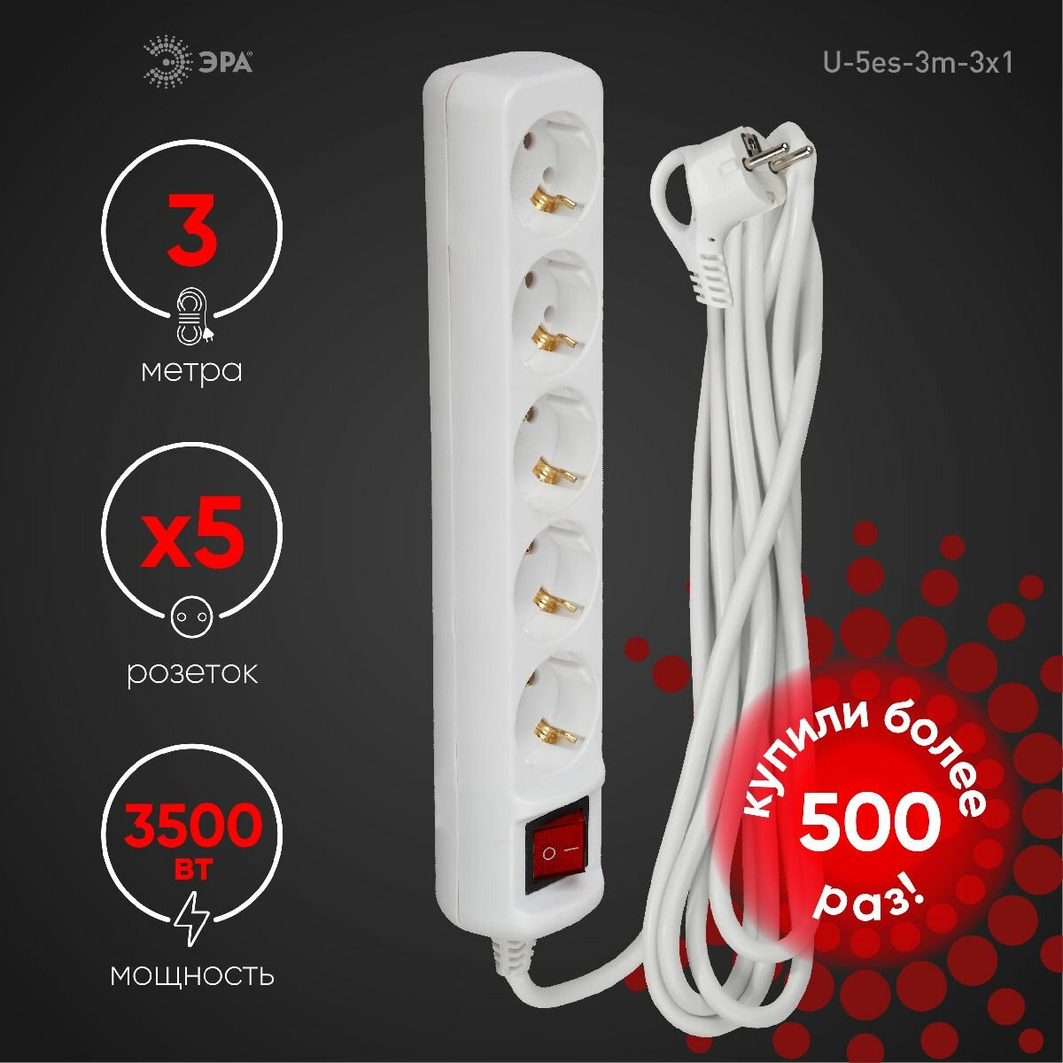 Купить Удлинитель ЭРА U-5es-3m, 5 розеток, с/з, 16А / 3500 Вт 5 3 м 1 м² белый