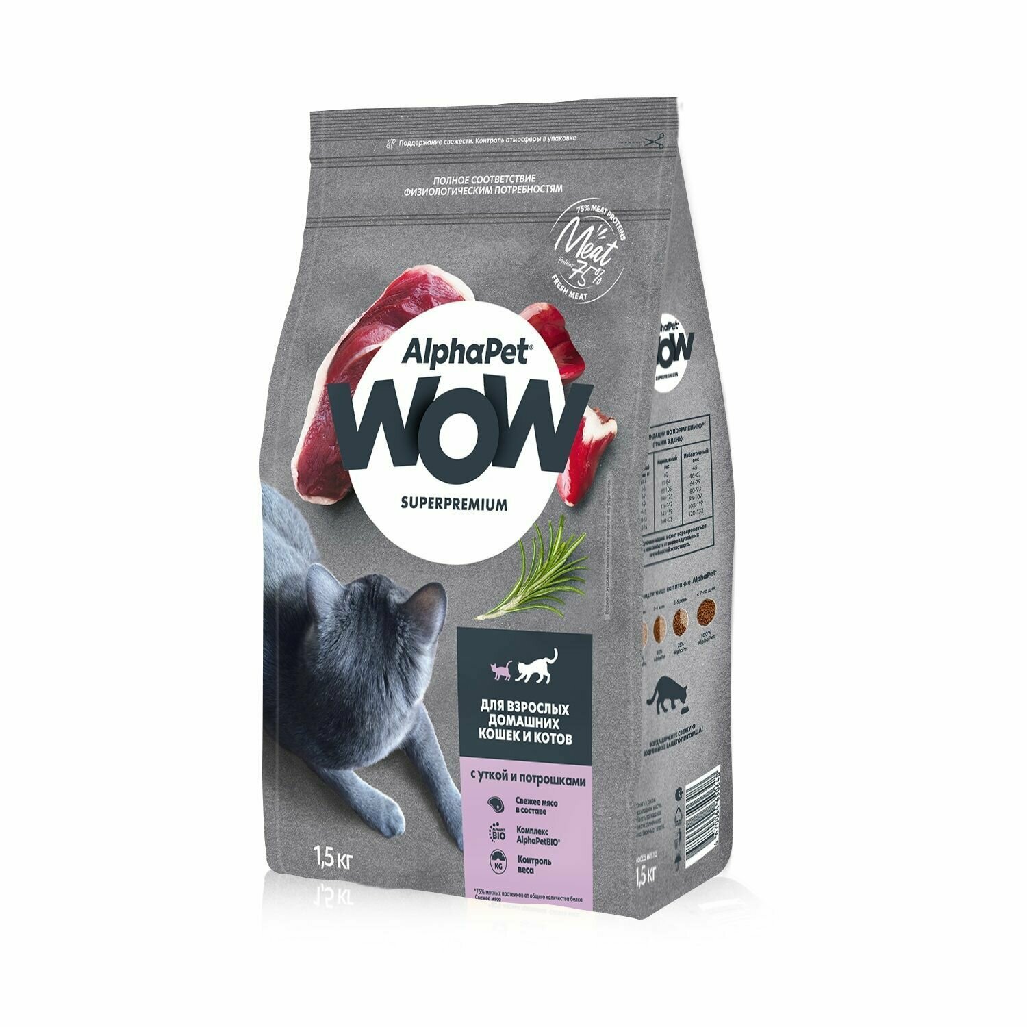 Купить AlphaPet WOW Сухой полнорационный корм Superpremium с уткой и потрошками, для взрослых домашних кошек и котов, 1,5 кг