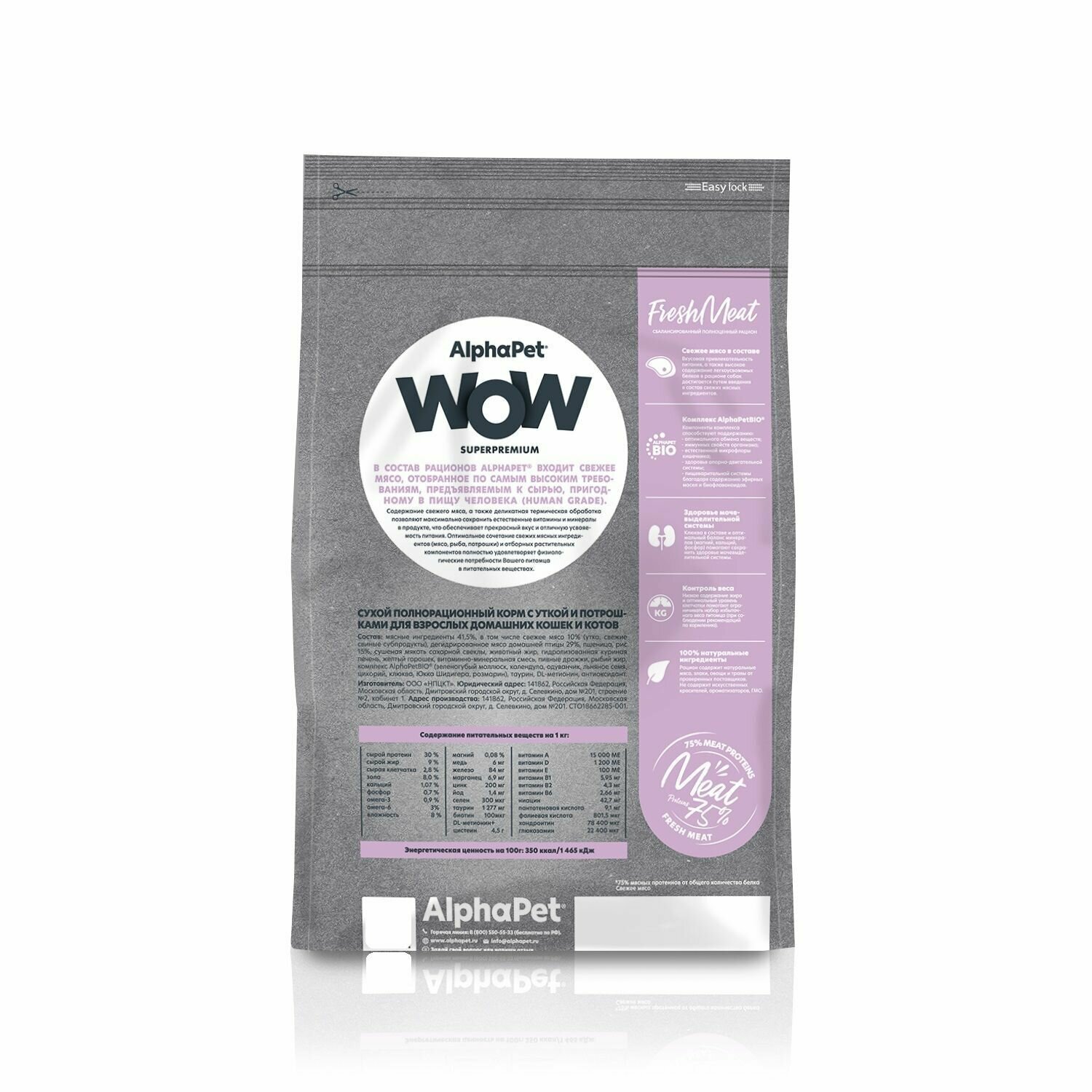 ALPHAPET WOW SUPERPREMIUM / Альфапет сухой полнорационный корм с уткой и потрошками для взрослых домашних кошек и котов, 350 грамм