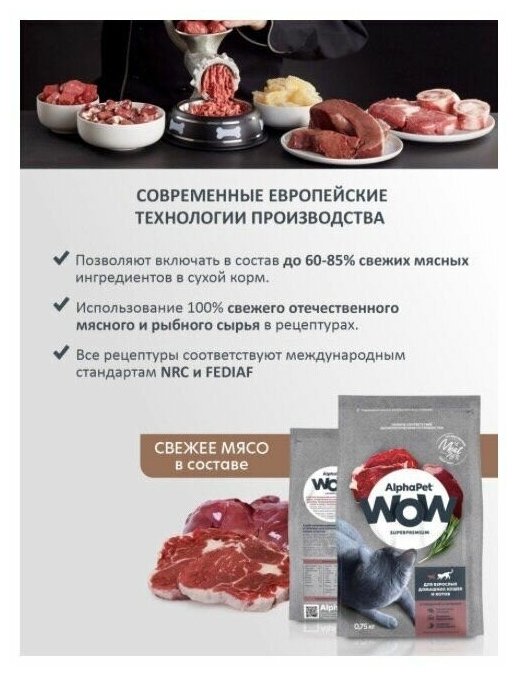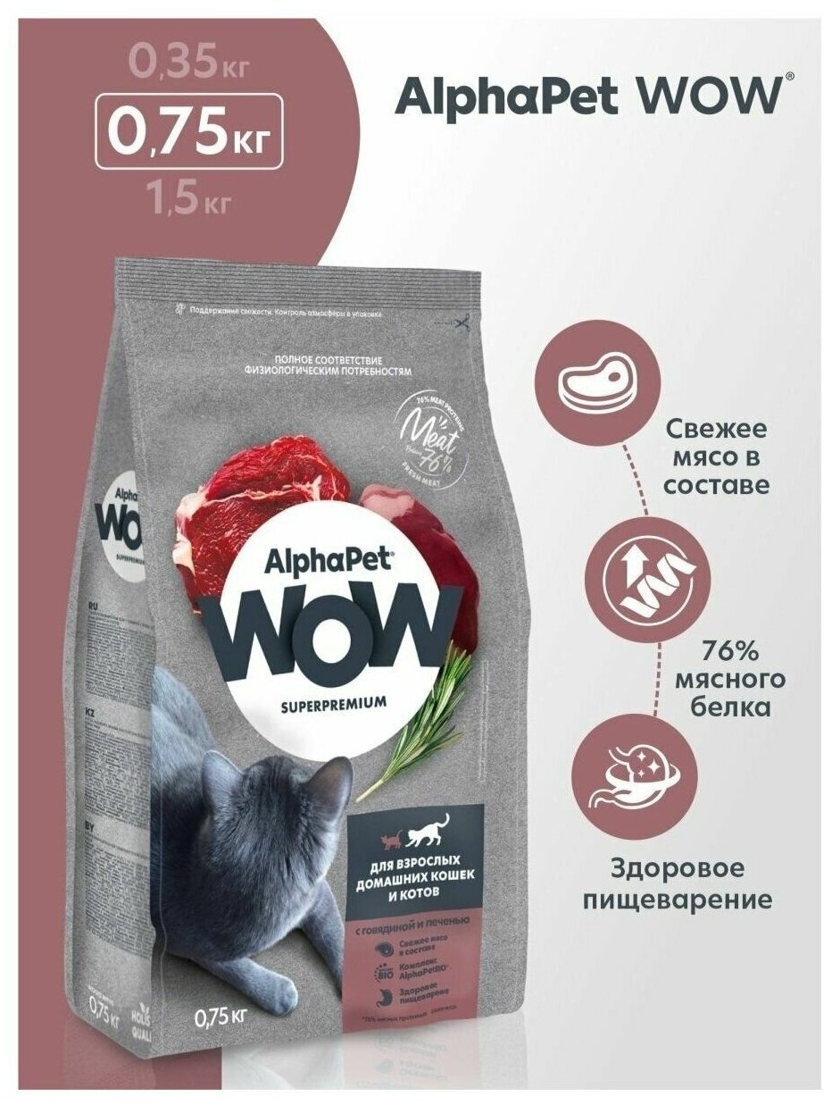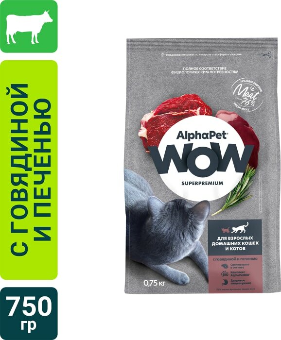 Корм сухой Alphapet WOW Superpremium с говядиной и печенью для взрослых домашних кошек и котов, 750 г
