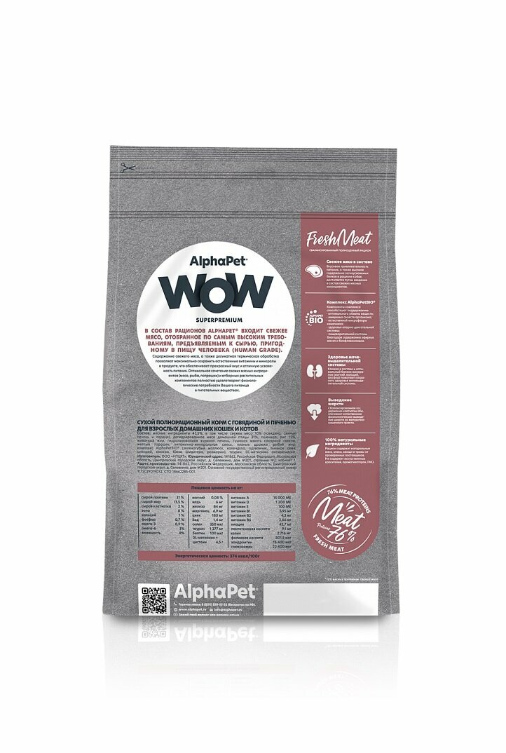 ALPHAPET WOW SUPERPREMIUM 350 г, сухой корм для взрослых домашних кошек и котов c говядиной и печенью, ALPHAPET WOW