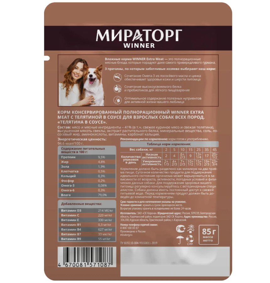 Корм Мираторг Winner Extra Meat (в соусе) для собак, с телятиной, 85 г x 24 шт
