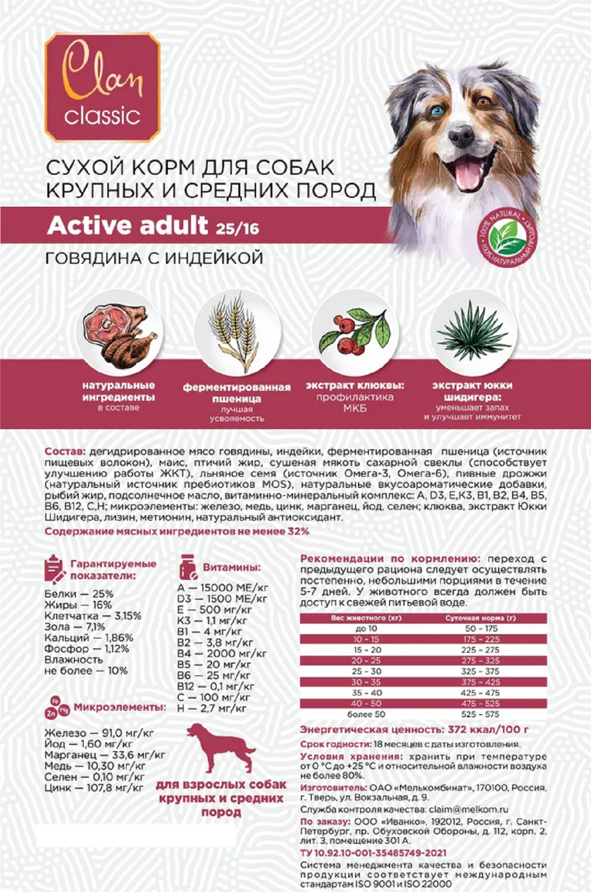CLAN CLASSIC Active 25/16 Сухой корм для активных собак средних и крупных пород Говядина Индейка