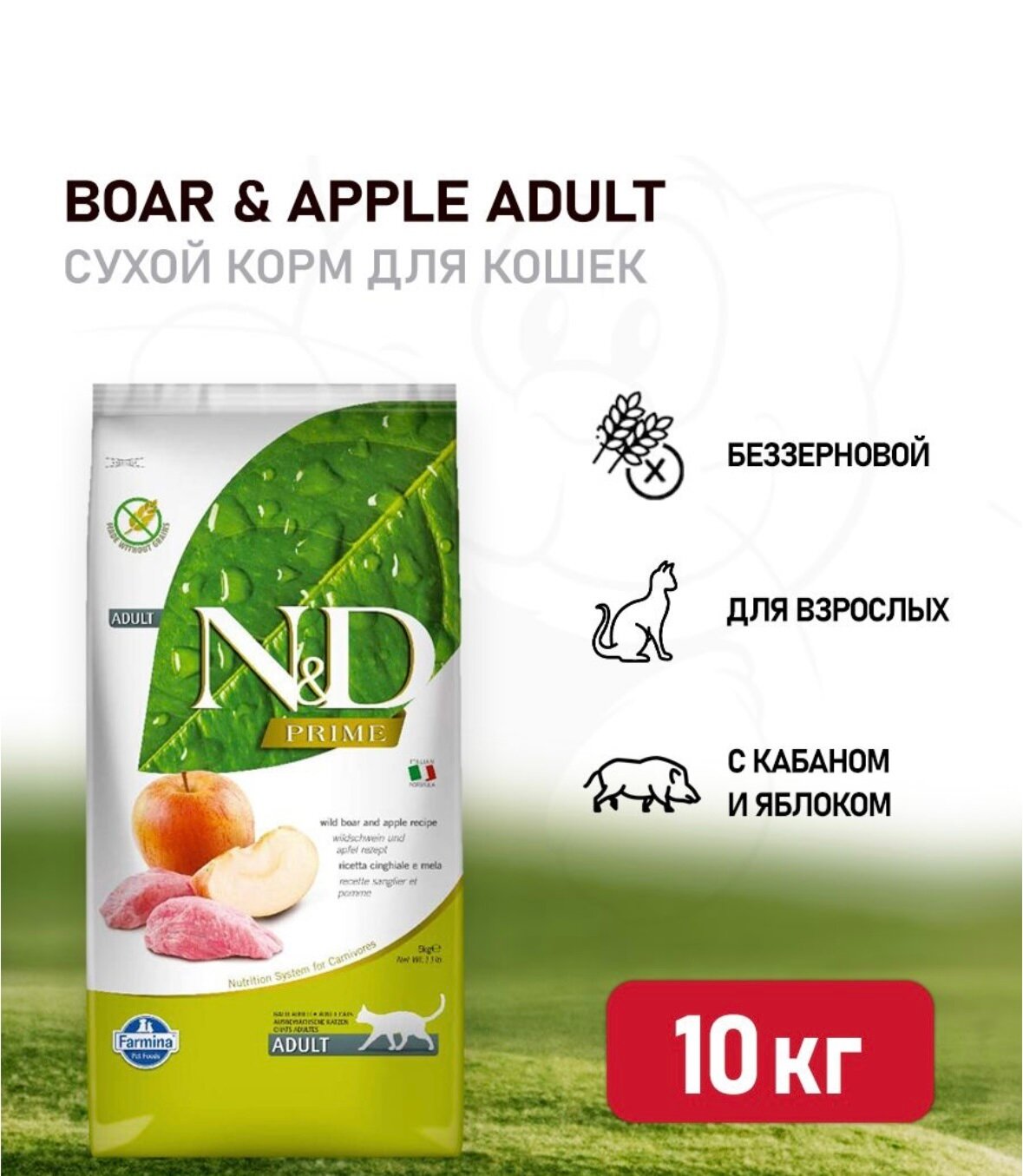 Купить Сухой корм Farmina N&D Prime Boar&Apple Adult, для взрослых кошек, беззерновой, кабан с яблоком, 10 кг