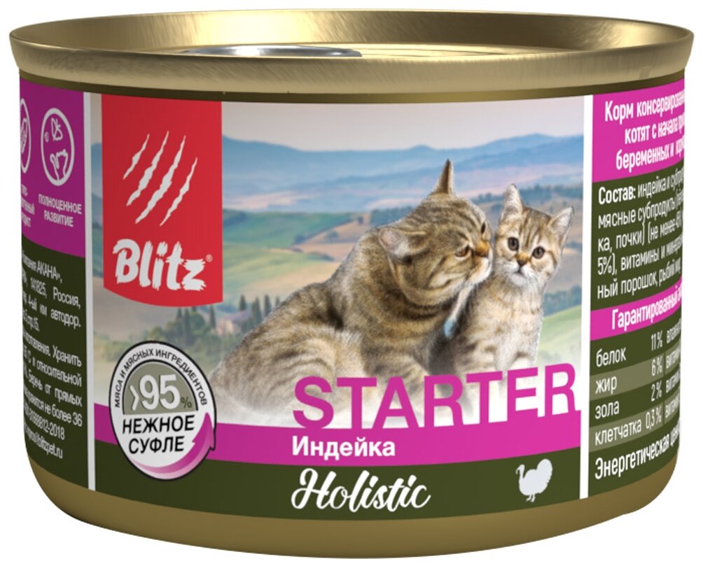BLITZ HOLISTIC STARTER для котят беременных и кормящих кошек суфле с индейкой банка 200 гр 200 гр х 12 шт
