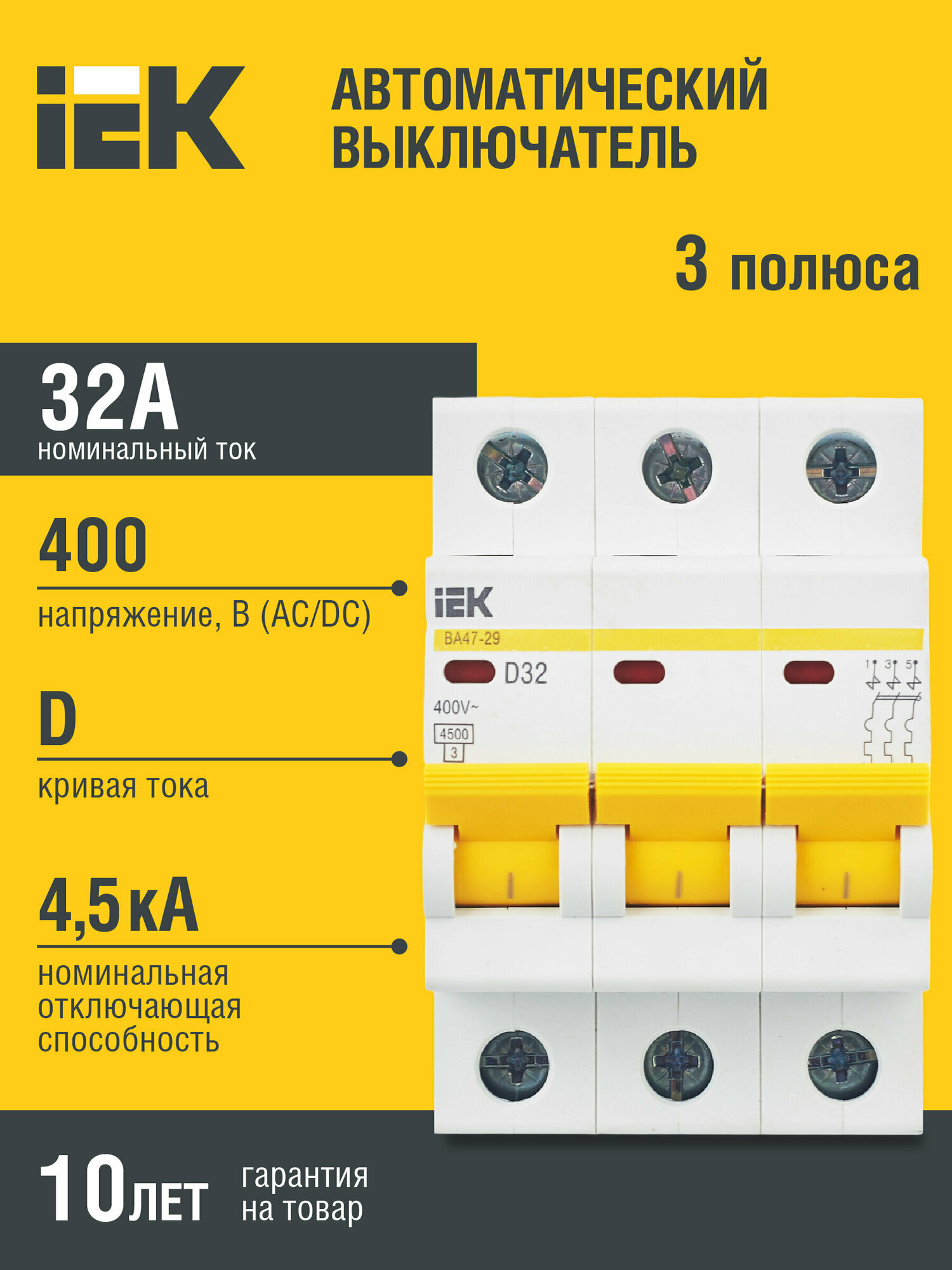 IEK Выключатель автоматический трехполюсный 10А D ВА47-29 4.5кА 9691623