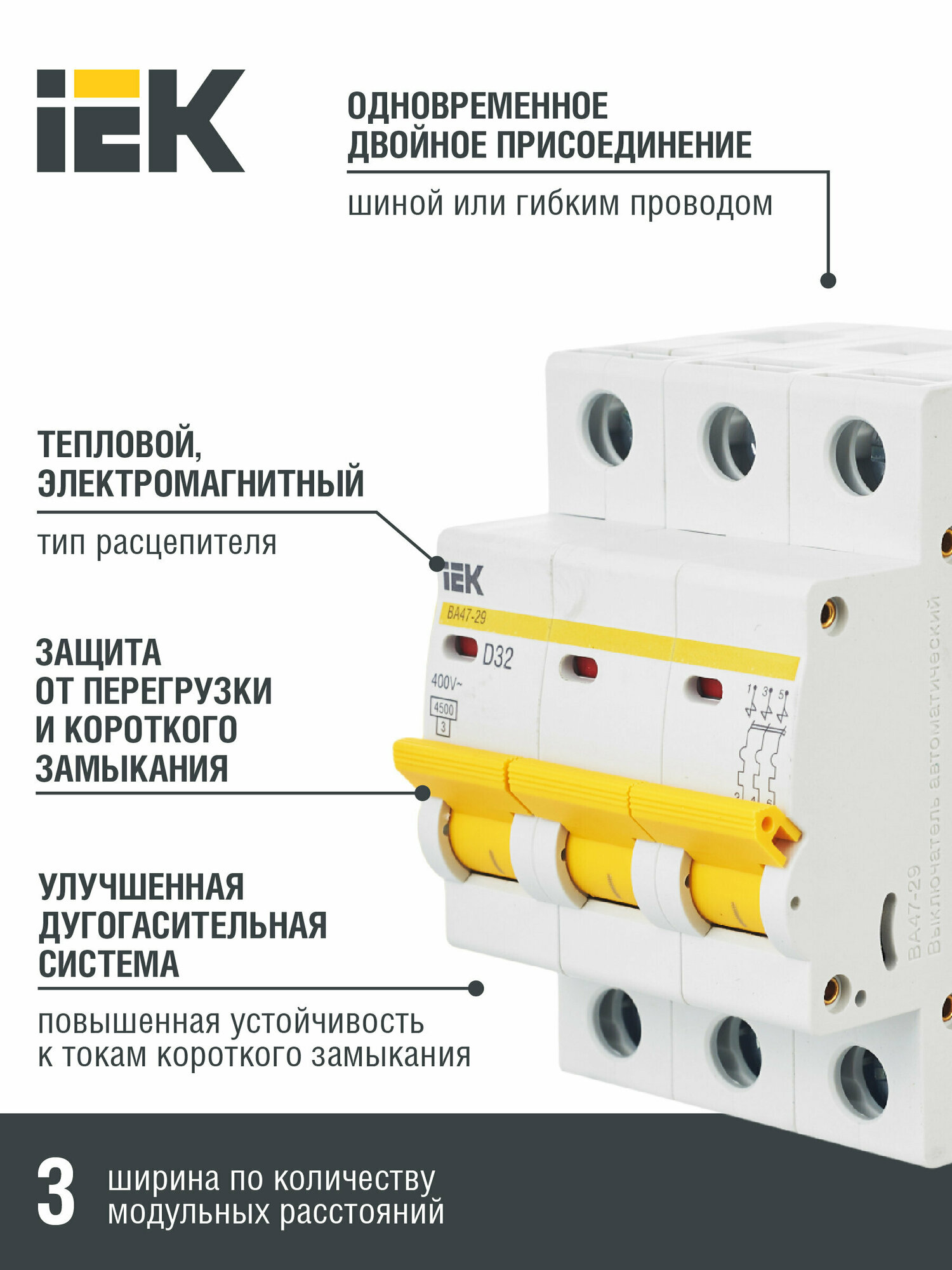 СохранитьВыключатель автоматический модульный 3п D 32А 4.5кА ВА47-29 IEK MVA20-3-032-D интересное: