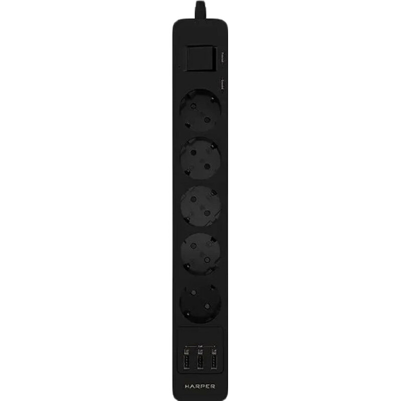 Сетевой фильтр Harper UCH-550 black (5 розеток, 3 USB-порта, 5 метров, шторки, встроенная защита от скачков напряжения и тока)