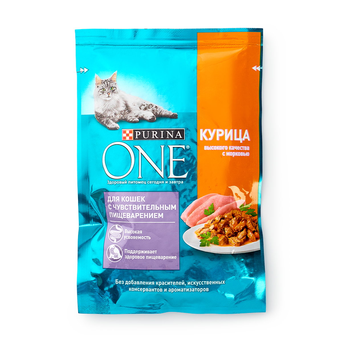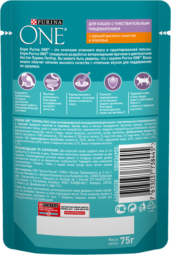 Корм для кошек PURINA ONE с чувствительным пищеварением, курица с морковью пауч 75г (упаковка - 26 шт)
